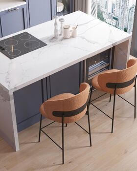 Форма и лаконичный дизайн. Стул гармонично сочетает эстетику стиля лофт и минимализм современного интерьера. Терракотовый букле в комбинации с черным металлическим каркасом придаёт модели сдержанную элегантность и универсальность, позволяя легко вписать её в любое пространство.