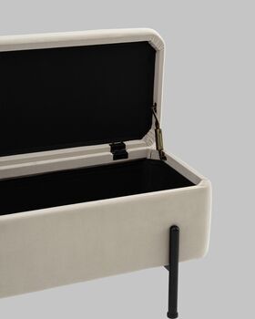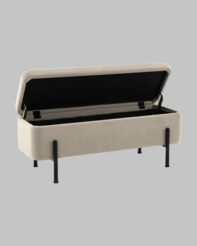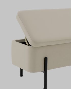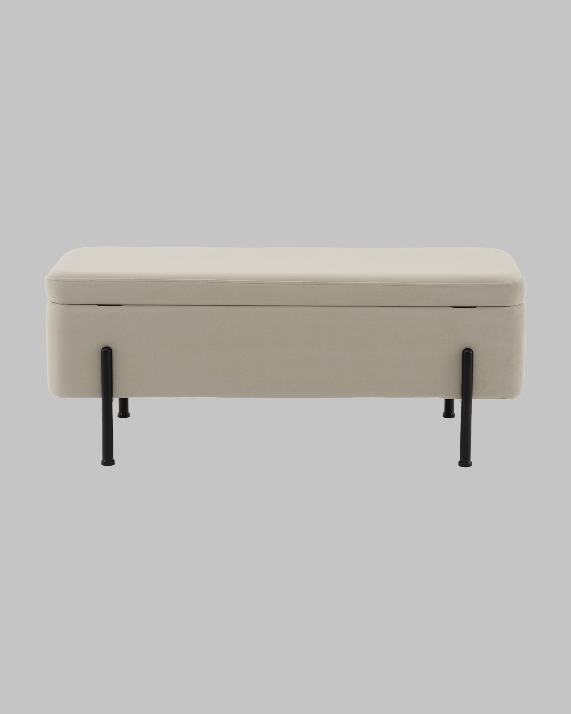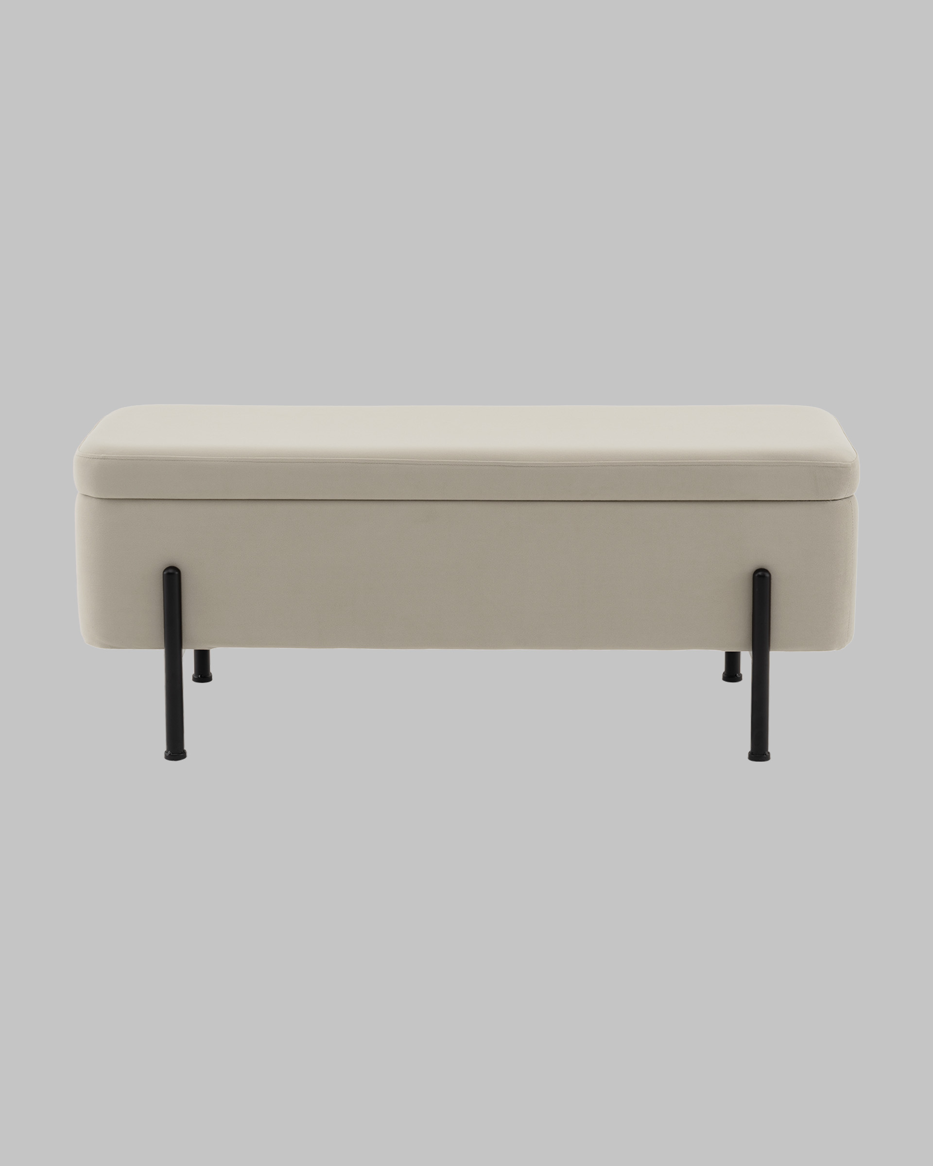 Функциональный акцент интерьера. Банкетка Болейн сочетает в себе лаконичный дизайн и продуманную функциональность. Обивка из мягкого велюра в бежевом оттенке придаёт ощущение уюта. Контрастные металлические ножки чёрного цвета подчёркивают современный характер модели и визуально облегчают конструкцию.
