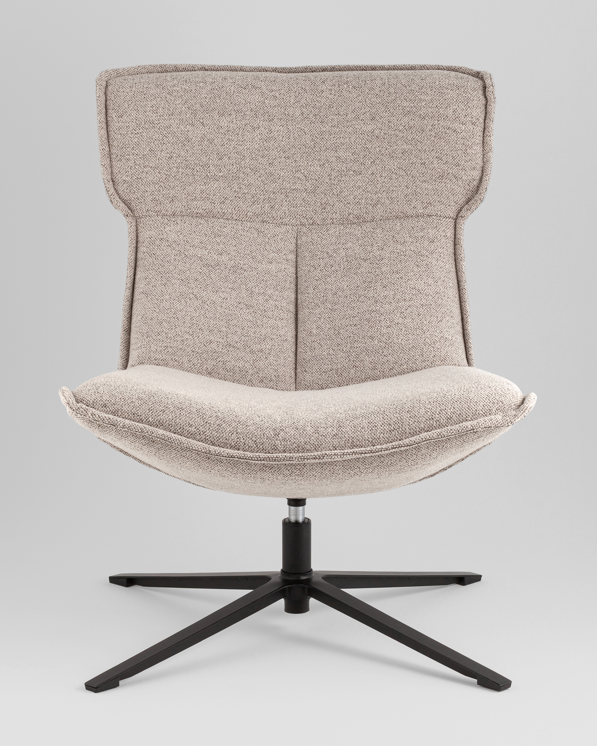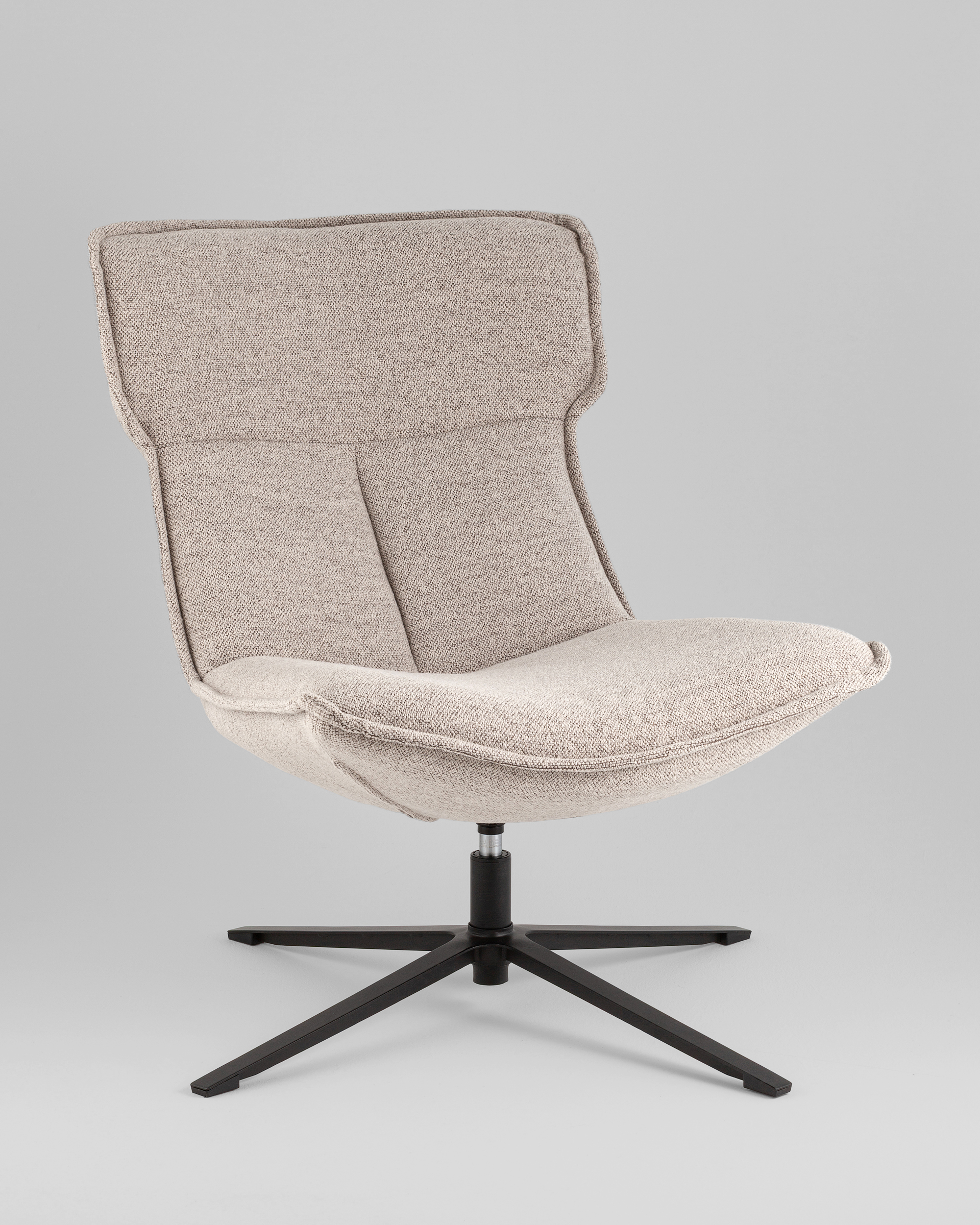 Кресло выполнено в лаконичном, но выразительном дизайне с изогнутыми формами, высокой спинкой и глубоким сиденьем. Обтекаемые линии и сбалансированные пропорции придают модели элегантность и визуальную лёгкость. Светлая обивка в сочетании с чёрным металлическим основанием создаёт эффектный контраст, подчёркивая современный и дизайнерский характер изделия.