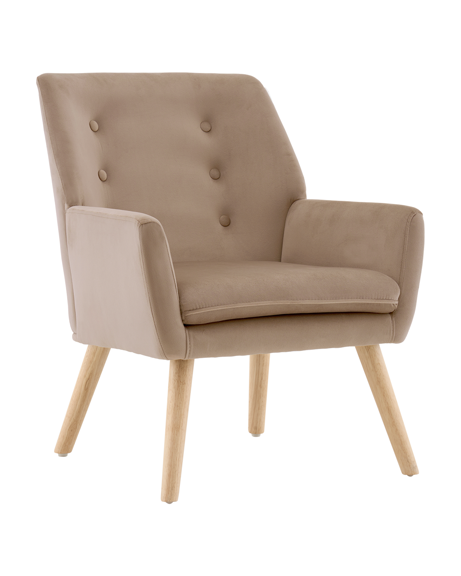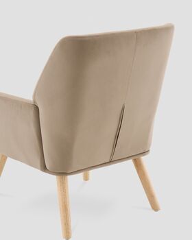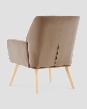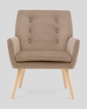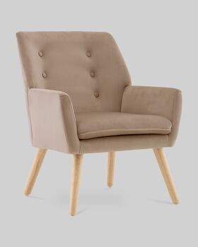 Обивка выполнена из прочного и приятного на ощупь велюра, который легко очищается и сохраняет насыщенность цвета. Ножки — из массива гевеи, окрашены в натуральный оттенок светлого дерева. Конструкция выдерживает до 120 кг.