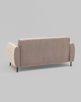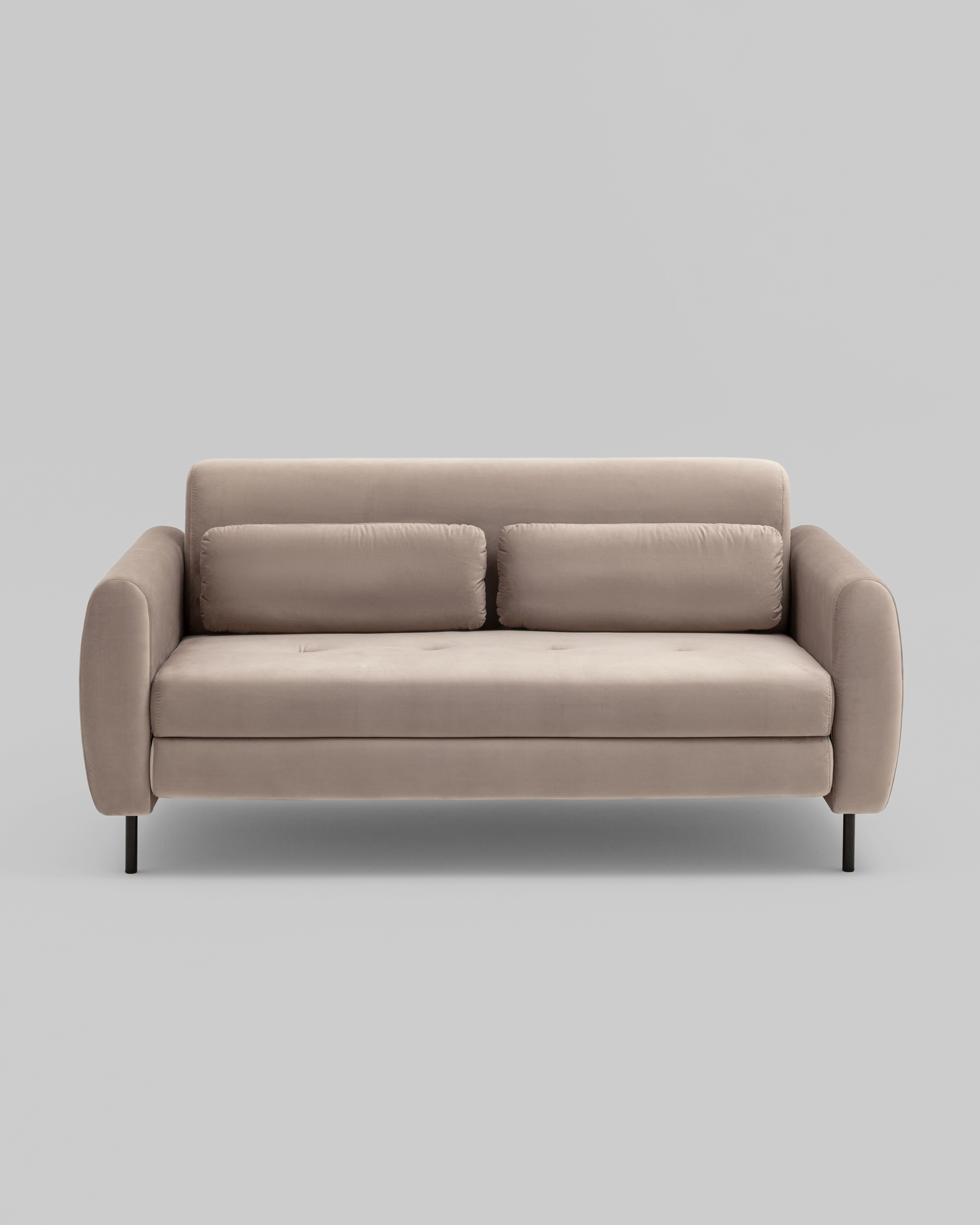 Особенности дизайна. Модель выполнена в современном стиле с элегантной серой велюровой обивкой. Прямые линии и компактные формы идеально подойдут как для небольших, так и для просторных помещений. Подлокотники округлой формы и декоративные подушки придают модели особый стиль. Черные металлические ножки придают легкость и изысканность внешнему виду, делая его подходящим для различных интерьерных решений.