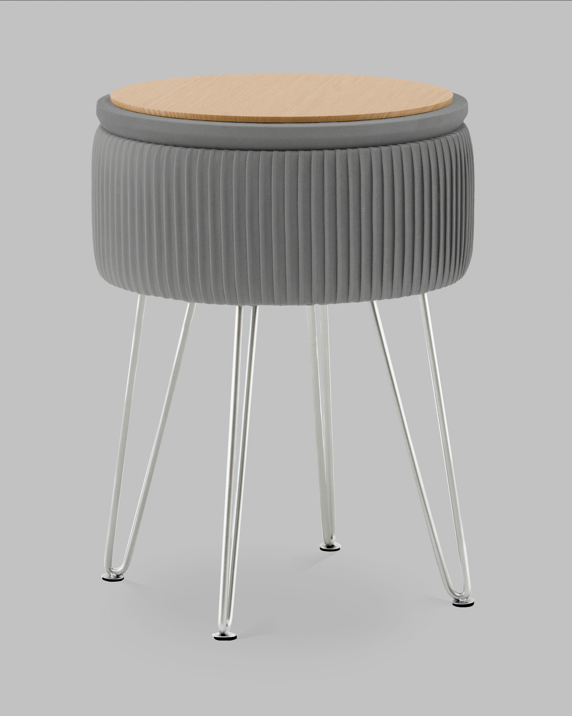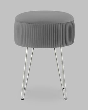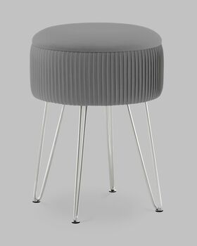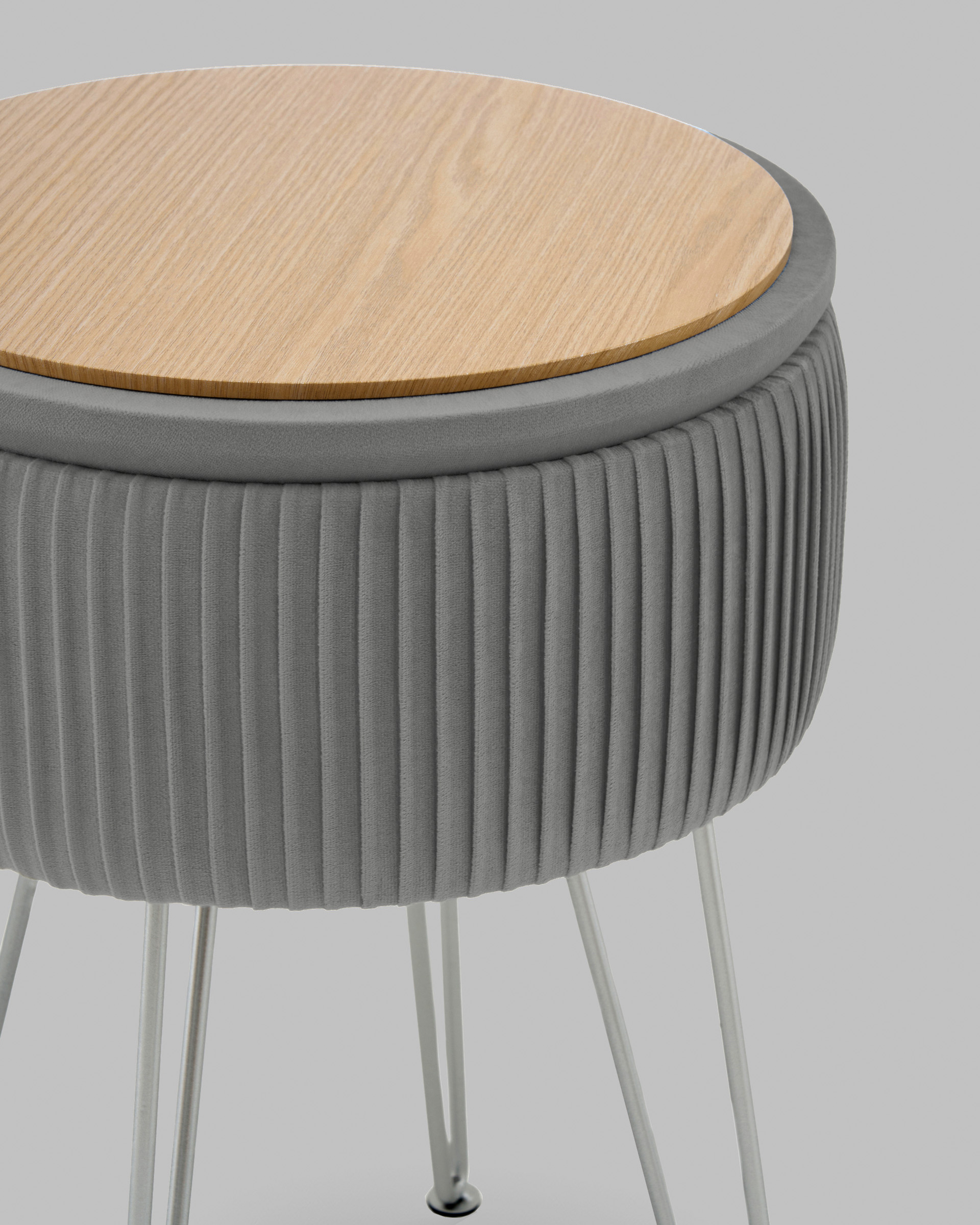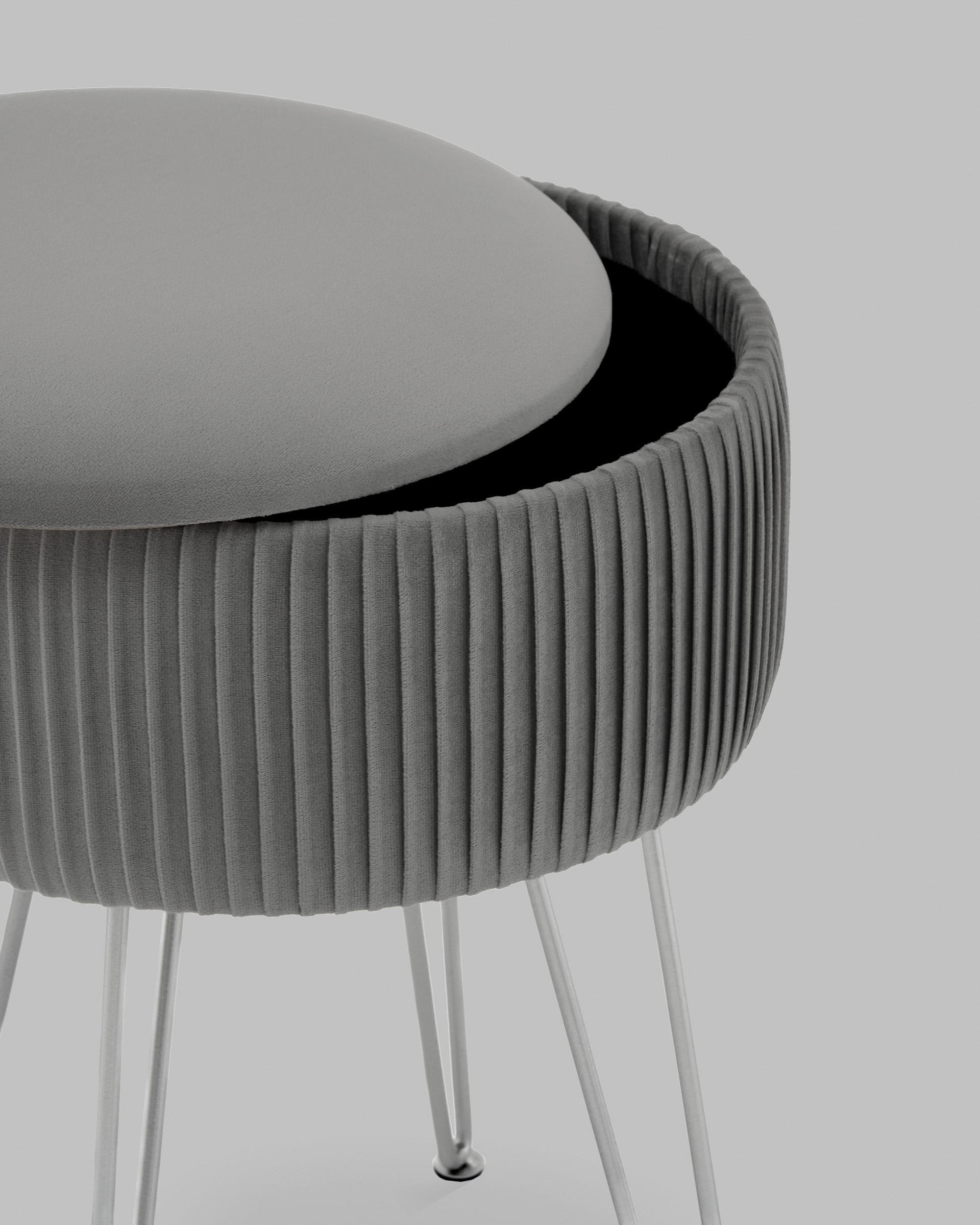 Лаконичный круглый пуф на металлических ножках с ящиком для хранения. Мягкая обивка выполнена из износостойкого велюра, тактильно приятный и долговечный материал. Под сидением имеется ящик для хранения мелочей, крышка полностью съемная. Он не только удобный, но и функциональный. Благодаря двухсторонней крышке, пуф можно трансформировать в журнальный столик.