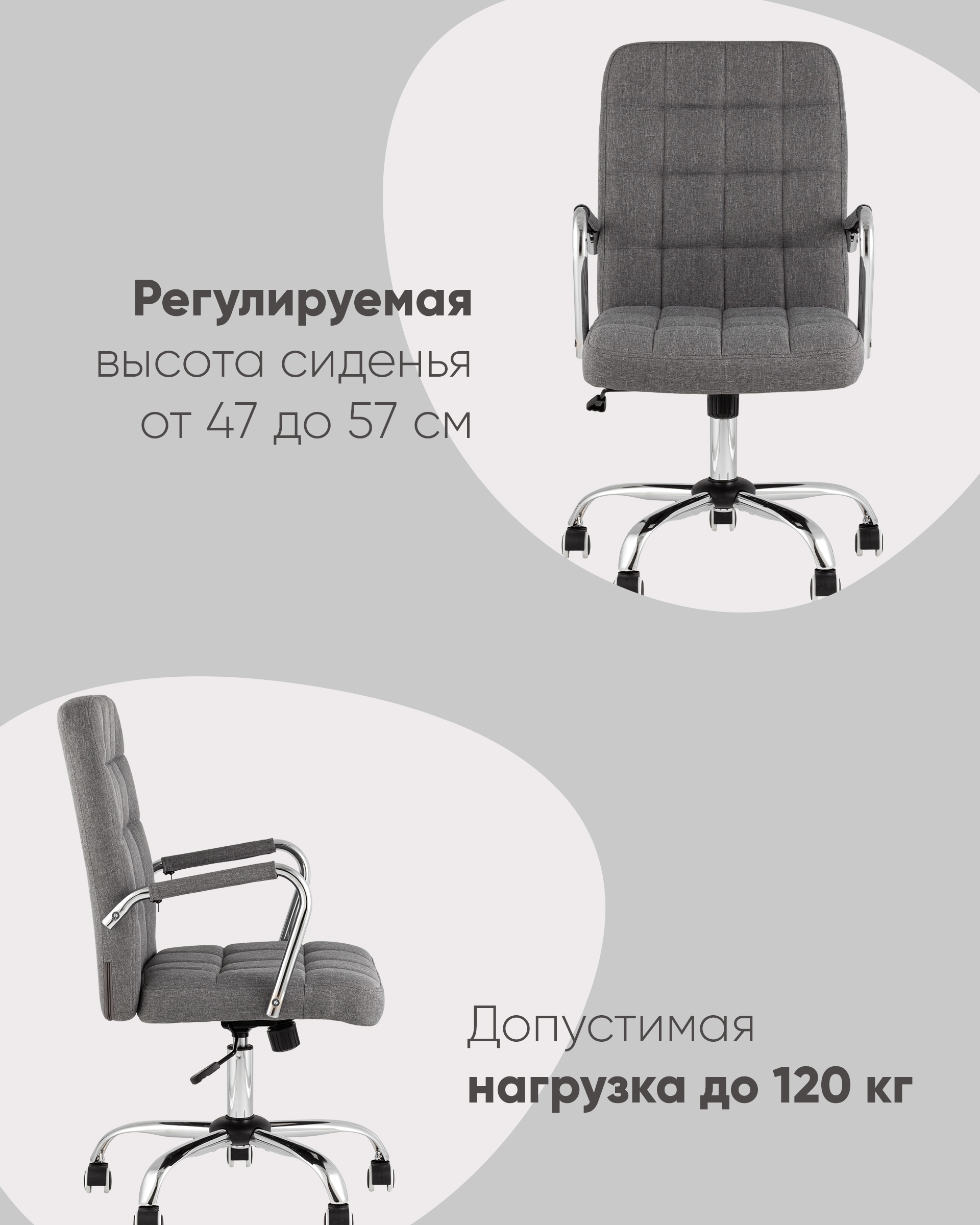 Эргономичная конструкция с мягким сиденьем и спинкой делает посадку удобной даже при длительном использовании. Максимальная нагрузка кресла — 120 кг, что подчеркивает его надежность. TopChairs Comfo — это стильное решение для комфортной работы дома или в офисе.