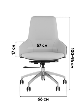 Материалы и цвета. Кресло обтянуто прочной светло-серой экокожей, которая приятна на ощупь и легко чистится. Задняя часть спинки выполнена в контрастном сером цвете, что придает модели современный и стильный вид. Крестовина из алюминия обеспечивает устойчивость и долговечность, а ролики из полиуретана и нейлона позволяют легко и бесшумно перемещаться по любым покрытиям пола.