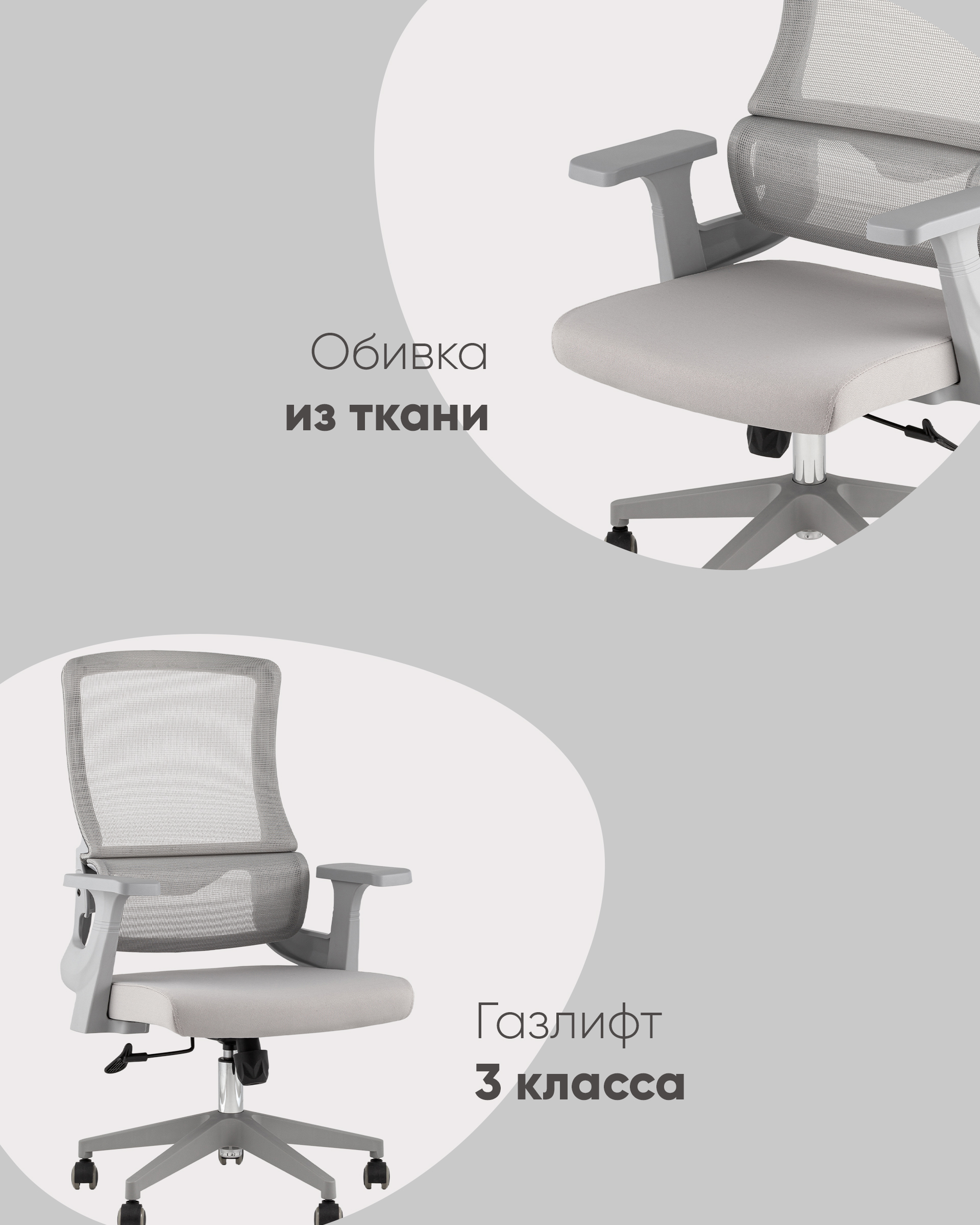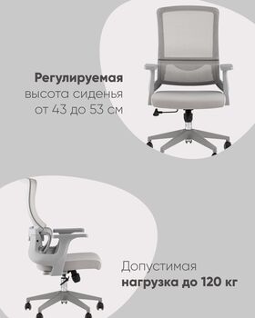 Материалы и дизайн. Кресло выполнено в универсальном сером цвете, что делает его стильным и практичным выбором для любого интерьера. Тканевое сиденье сочетает мягкость и прочность, а сетчатая спинка обеспечивает хорошую вентиляцию, предотвращая перегрев во время долгих рабочих часов.