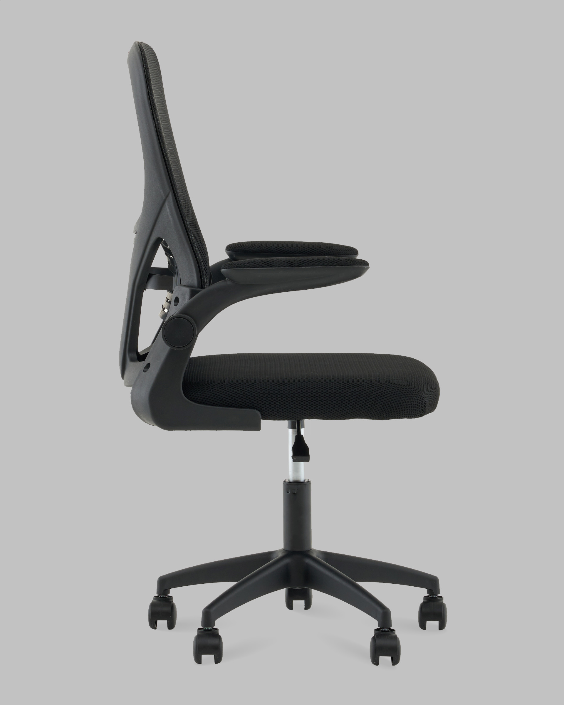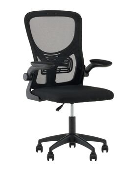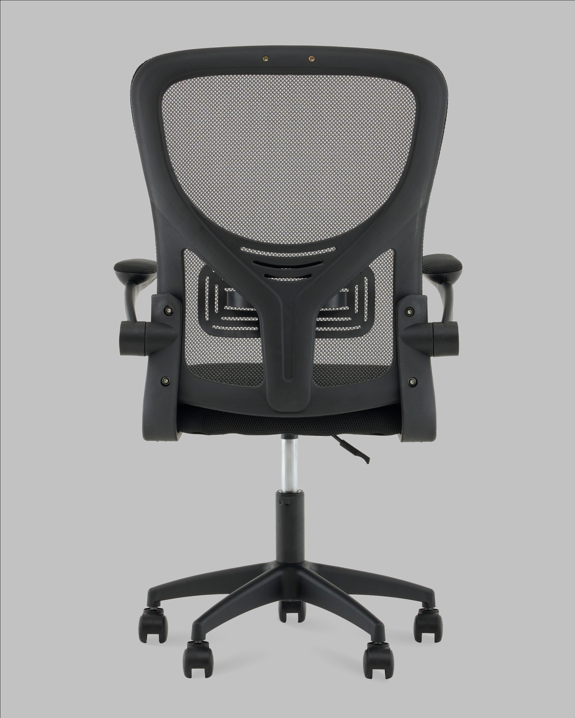 Прочная крестовина и надежные полипропиленовые колеса обеспечивают устойчивость и легкость перемещения. Обивка выполнена в черном цвете, подлокотники и крестовина также изготовлены из износостойкого полипропилена. Механизм качания типа пиастра делает использование кресла особенно удобным.