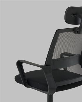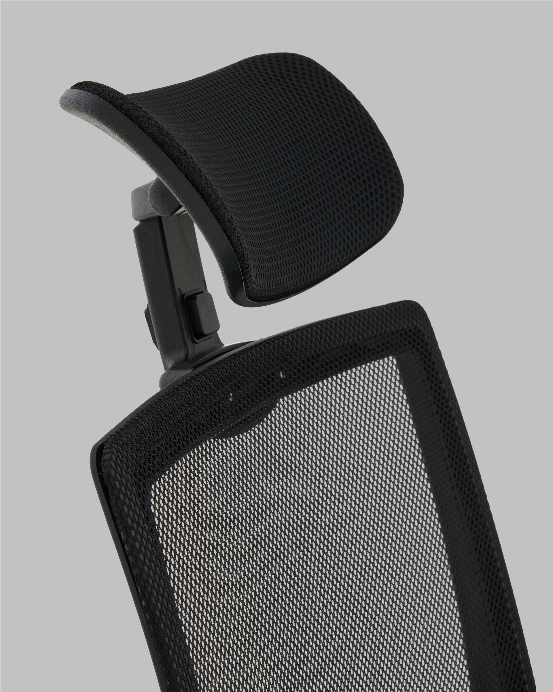 Спинка кресла имеет анатомическую форму и оснащена дополнительной поддержкой поясничного отдела, что снижает нагрузку на спину. Для ещё большего комфорта предусмотрен регулируемый подголовник, который легко настраивается под нужную высоту и угол наклона.