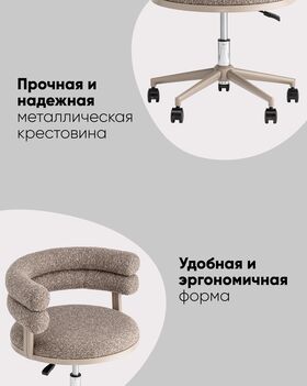 Дизайн и материалы. Стул привлекает своим современным и элегантным дизайном. Обивка выполнена из плотного материала букле светло-коричневого цвета, который обладает мягкостью и долговечностью. Ножки выполнены из металла с бежевым покрытием.
