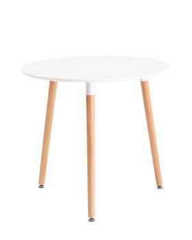 Круглая столешница диаметром 80 см выполнена из качественного МДФ белого цвета толщиной. Деревянные ножки из жестких сортов дерева (бука). На нижней части ножек предусмотрены регулировочные пятаки для беспроблемной установки стола на неровный пол.  Высота стола - 74 см.