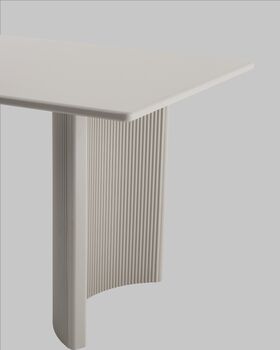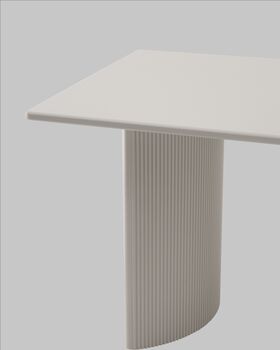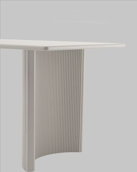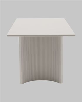 Материалы и дизайн. Столешница выполнена из высококачественного МДФ с покрытием 3D бумагой, что придает столешнице элегантный внешний вид. Толщина столешницы составляет 2,5 см, обеспечивая прочность конструкции. Прямоугольная форма и оригинальные ножки из МДФ с эффектом плиссе добавляет изюминку в общий облик. Нежный бежевый цвет стола делает его универсальным для различных зон — от дома до общественных пространств.