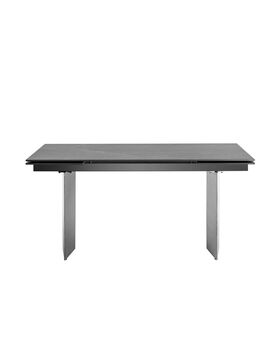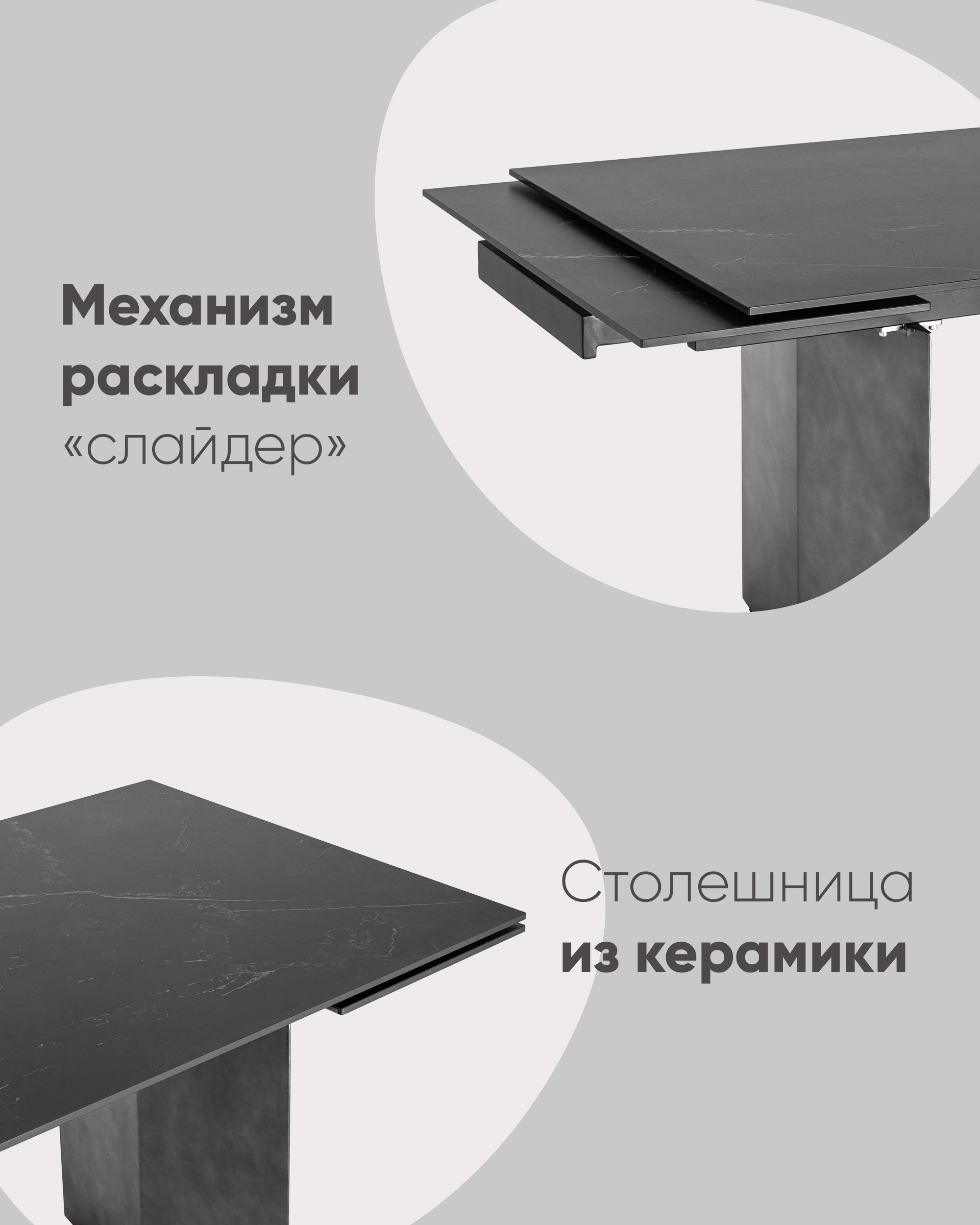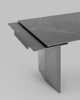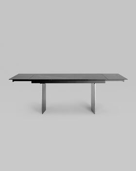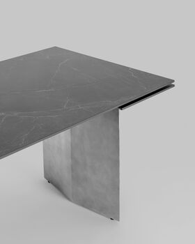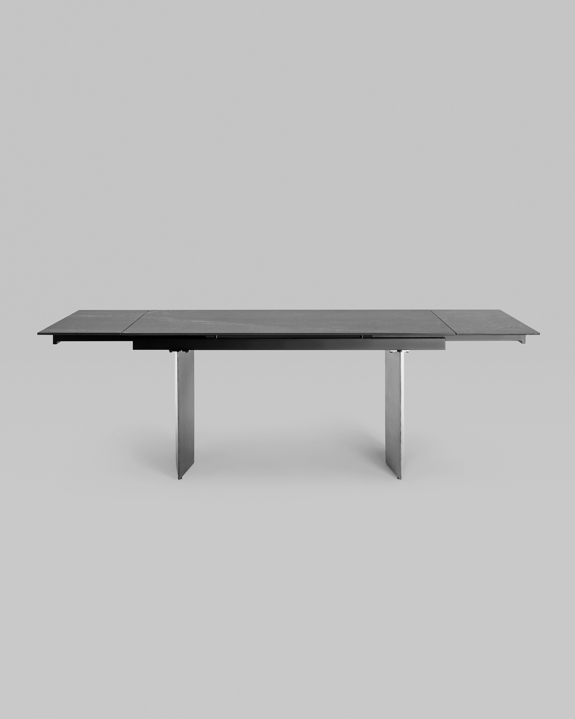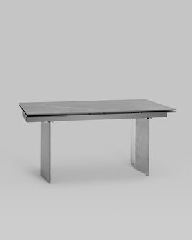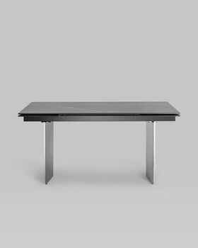 Массивный стол Селин в монохромном цвете с мраморным рисунком. Прямоугольная столешница выполнена из цельной керамики - долговечный и прочный материал устойчивый к внешним воздействиям. Внушительную длину стола со 180 см можно, при необходимости, увеличить до 260 см за счет раздвижных панелей по бокам. Раздвижной механизм прост в использовании и не требует много времени для сборки. Металлические опорные ножки в лаконичном дизайне надёжно удерживают всю конструкцию и дополняют монолитный образ. Данная модель идеальный вариант для большой кухни или гостиной.