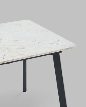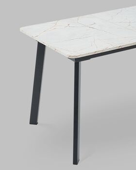 Элегантный дизайн и практичность Обеденный стол Batu new — это удачное сочетание современного стиля и функциональности. Прямоугольная форма столешницы в изысканном оттенке азул оникс привносит в интерьер нотку утончённости, а чёрное металлическое подстолье подчёркивает строгую геометрию и устойчивость конструкции.
