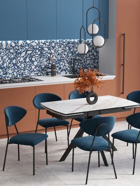 Стол обеденный раскладной Галац привлекает внимание эффектной столешницей из закалённого стекла с мраморным рисунком. Такой дизайн имитирует натуральный камень и придаёт столу дорогой, изысканный вид, делая его ярким акцентом в интерьере.