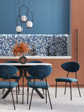Надёжная конструкция и функциональность Прочное металлическое основание в чёрном цвете выполнено в виде геометричной опоры с расходящимися под углом ножками. Эта форма обеспечивает отличную устойчивость и современный характер, визуально облегчая конструкцию и подчёркивая контраст с насыщенным рисунком столешницы.