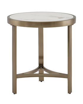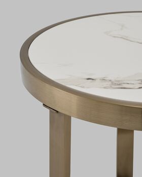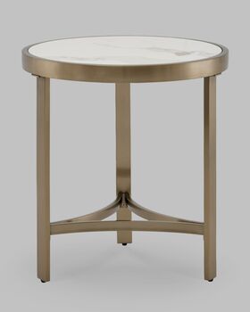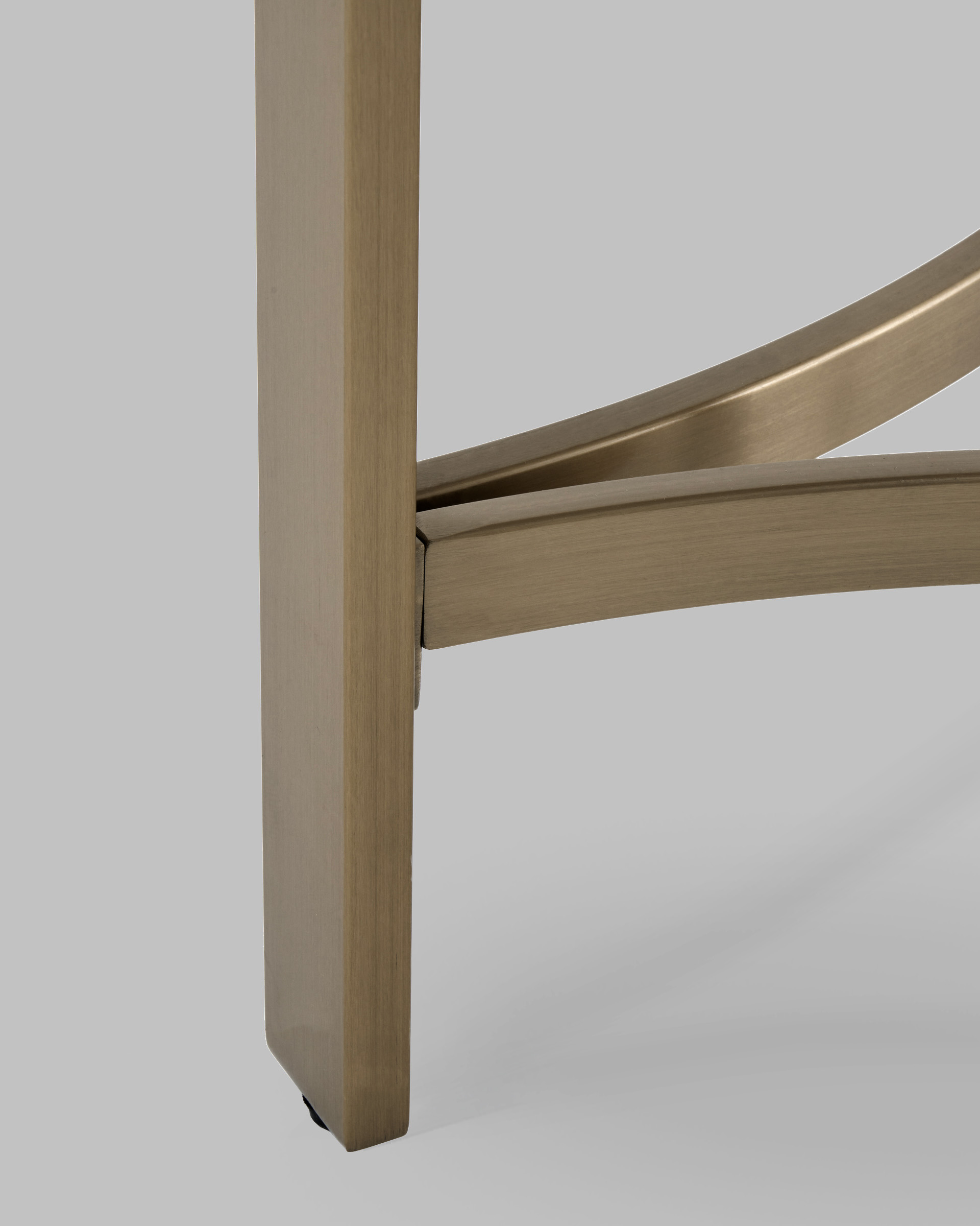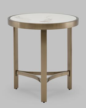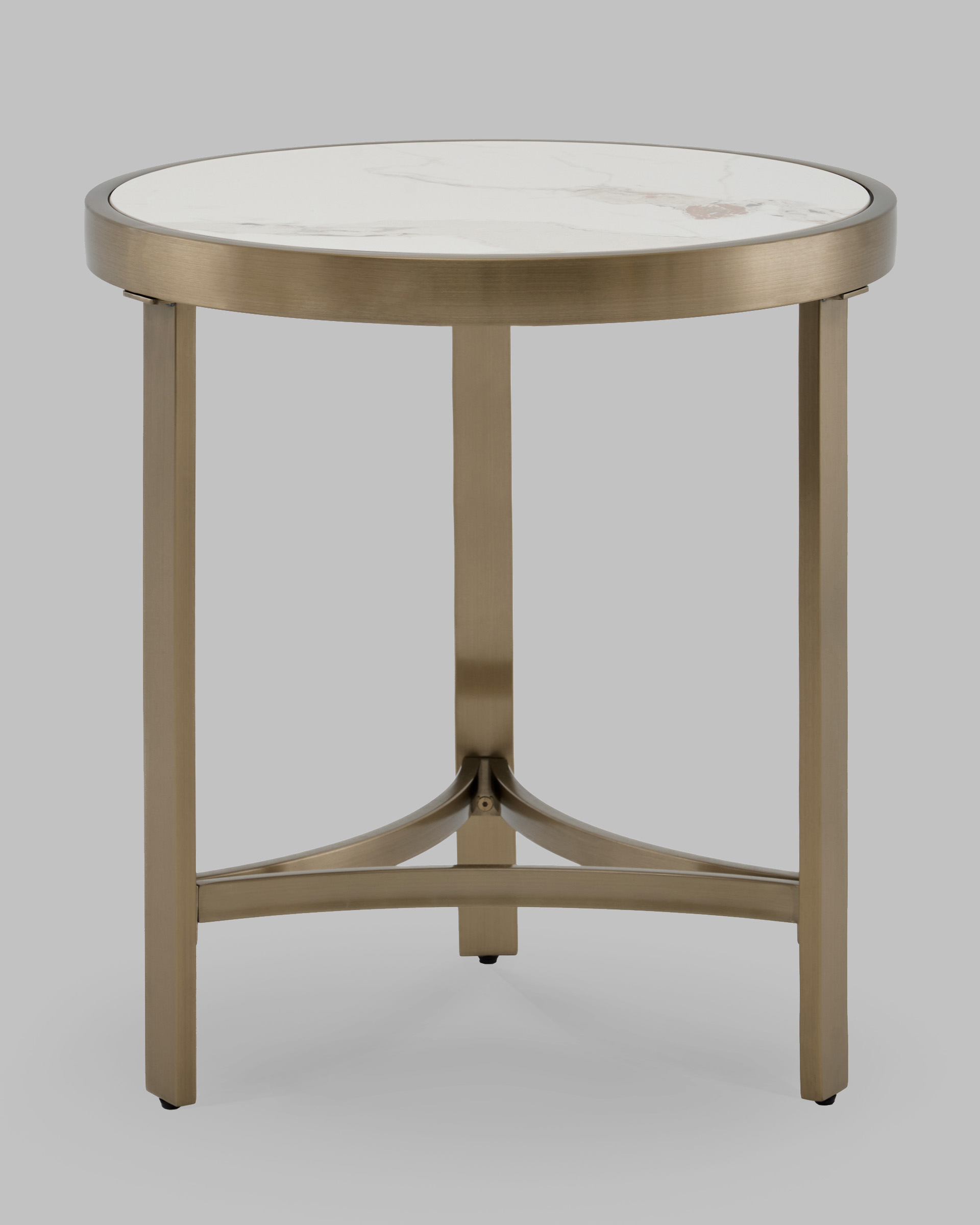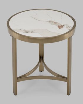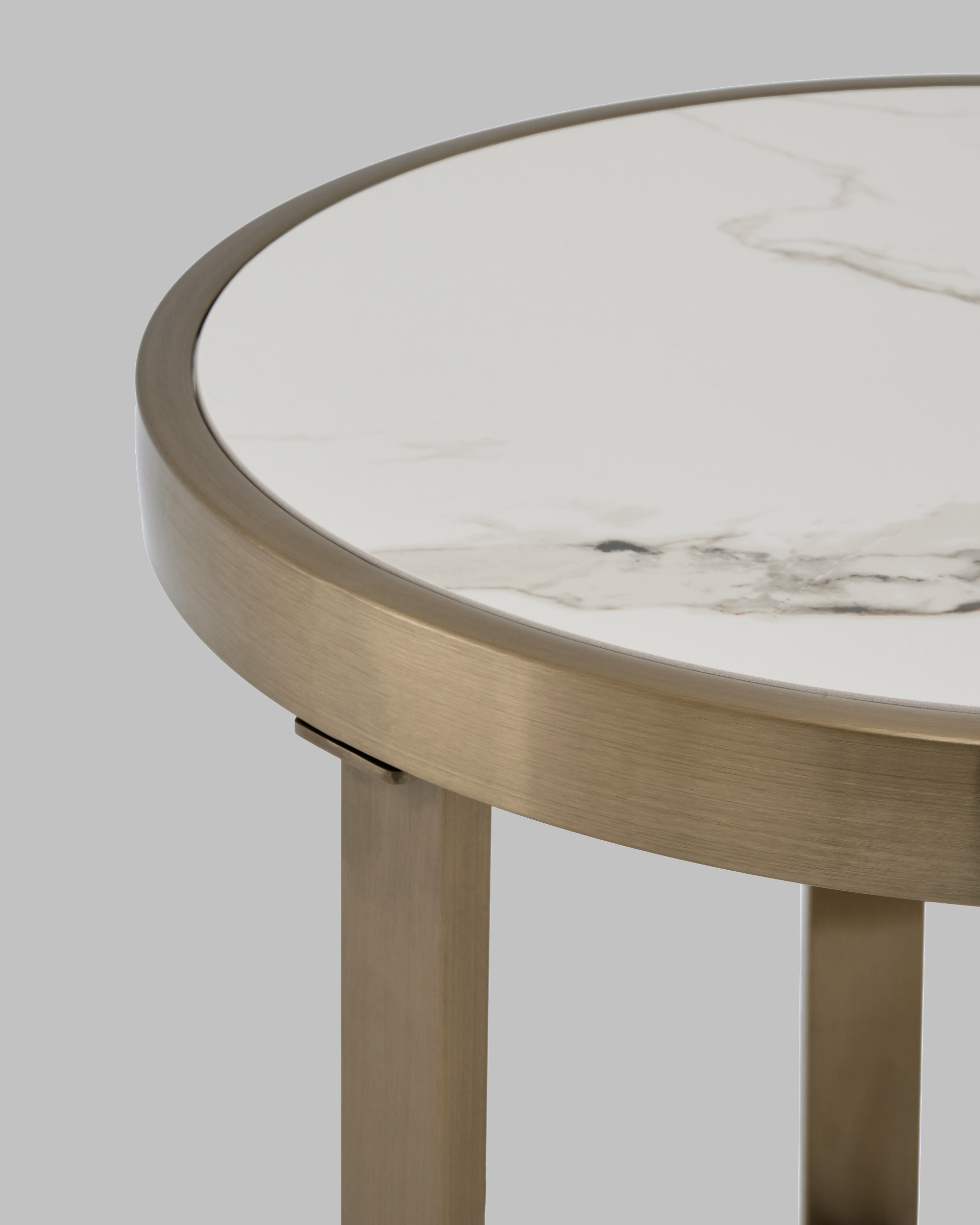 Журнальный столик Адриана — это воплощение утончённой роскоши и современного стиля. Светлая столешница с изысканным рисунком под керамику гармонично сочетается с металлическим основанием в цвете шампань. Геометрически выверенная опора с перекрёстными металлическими дугами в основании придаёт дополнительную устойчивость и дизайнерскую выразительность. Такое решение делает столик выразительным акцентом в любом интерьере.