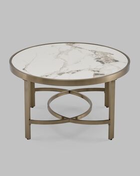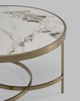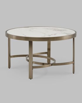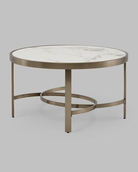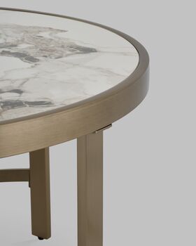 Журнальный столик Адриана — это воплощение утончённой роскоши и современного стиля. Светлая столешница с изысканным рисунком под керамику гармонично сочетается с металлическим основанием в цвете шампань. Геометрически выверенная опора с перекрёстными металлическими дугами в основании придаёт дополнительную устойчивость и дизайнерскую выразительность. Такое решение делает столик выразительным акцентом в любом интерьере.