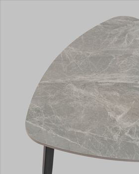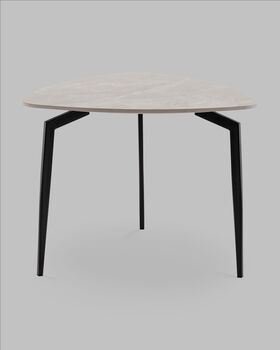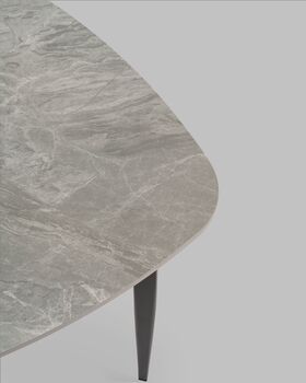 Столешница выполнена из керамики в благородном сером оттенке с имитацией мраморной текстуры. Это не только визуально привлекательное решение, но и практичное: керамика устойчива к царапинам, высокой температуре и легко очищается. Ножки из металла обеспечивают надёжность и долгий срок службы изделия.