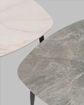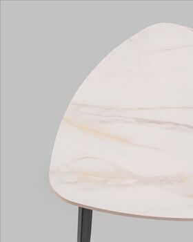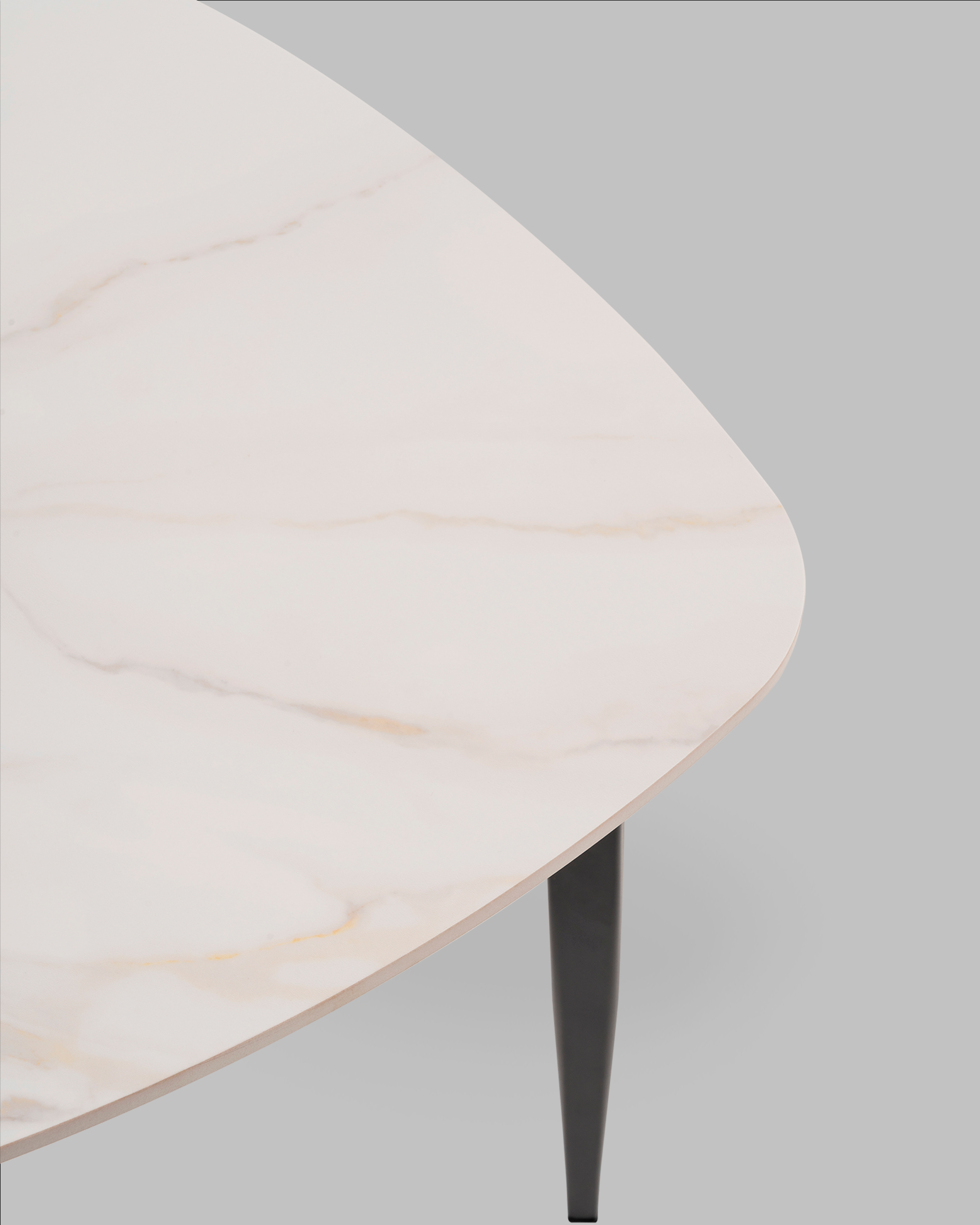 Столешница выполнена из керамики в благородном светлом оттенке с имитацией мраморной текстуры. Это не только визуально привлекательное решение, но и практичное: керамика устойчива к царапинам, высокой температуре и легко очищается. Ножки из металла обеспечивают надёжность и долгий срок службы изделия.