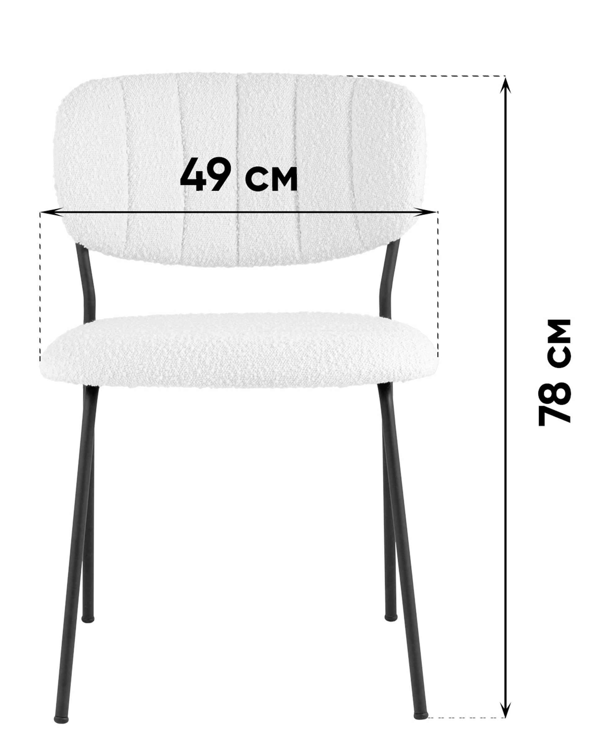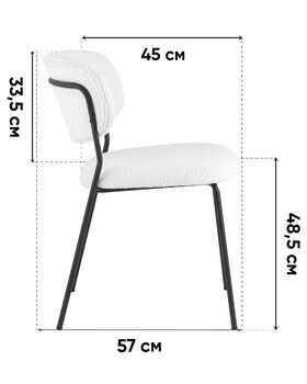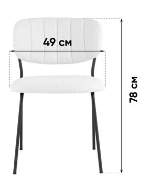 Современный обеденный стул без подлокотников и металлическими ножками. Обивка выполнена из мягкой и легкой ткани букле. Красивый и очень мягкий материал, который оставляет ощущение теплоты и уюта. Металлический каркас черного цвета огибает спинку и плавно переходит из подлокотников в ножки. Широкое сиденье обеспечивает удобную посадку и уют.