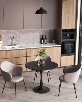 Стильная модель кухонного стула с мягкими округлыми формами. Металлический каркас обеспечивает надежную поддержку. Мягкая обивка из шенилла и удобная посадка обеспечивают комфорт. Уюта также добавляют подлокотники, которые плавно перетекают из спинки, создавая единую конструкцию. Базовая расцветка и лаконичный дизайн позволяют вписать стулья в различные современные интерьеры.