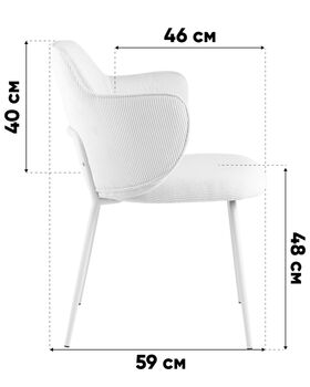 Материалы и цвета. Стул выполнен в мягком вельвете белого цвета, который придаёт модели изысканный и уютный вид. Белый металлический каркас и ножки обеспечивают прочность и устойчивость, гармонично дополняя светлый оттенок обивки.