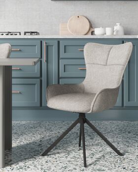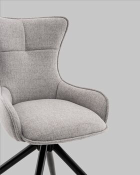Обивка выполнена из мягкой и приятной на ощупь ткани рогожки, прочного и износостойкого материала. Эргономичная форма спинки и сиденья обеспечивает комфорт при длительном сидении. Модель оснащена поворотно-возвратным механизмом 180°, позволяющим свободно поворачиваться и автоматически возвращаться в исходное положение — это удобно и практично в ежедневном использовании.