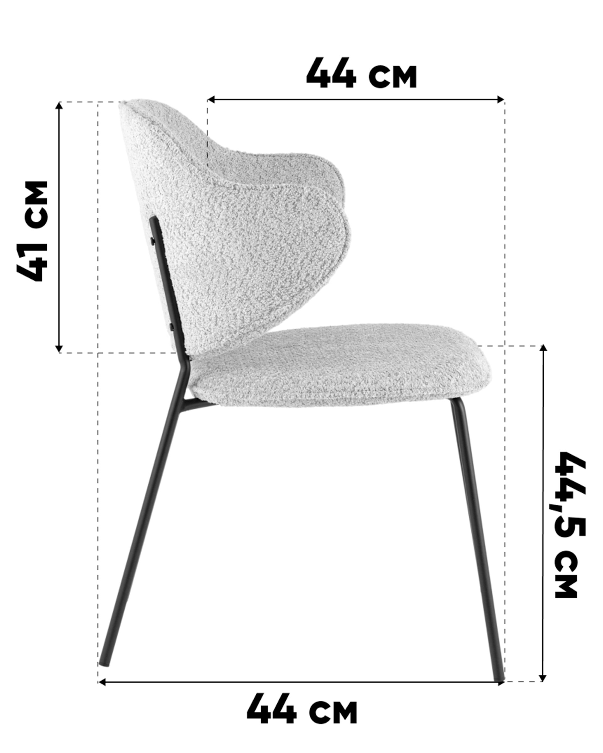 Материалы и цвета. Сиденье и спинка покрыты мягким тканевым материалом букле цвета охра, который имеет оригинальную фактуру и приятен на ощупь. Ножки выполнены из металла и выкрашены в черный цвет.