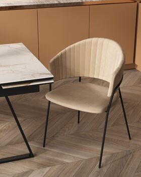Стильный кухонный стул с оригинальной формой спинки, высокой поддержкой и подлокотниками. В качестве обивки используется мягкий велюр – приятный на ощупь износостойкий, гигроскопичный материал. Металлический каркас в черном цвете огибает спинку и выступает аккуратным акцентом модели. Широкое сиденье обеспечивает удобную посадку и уют.