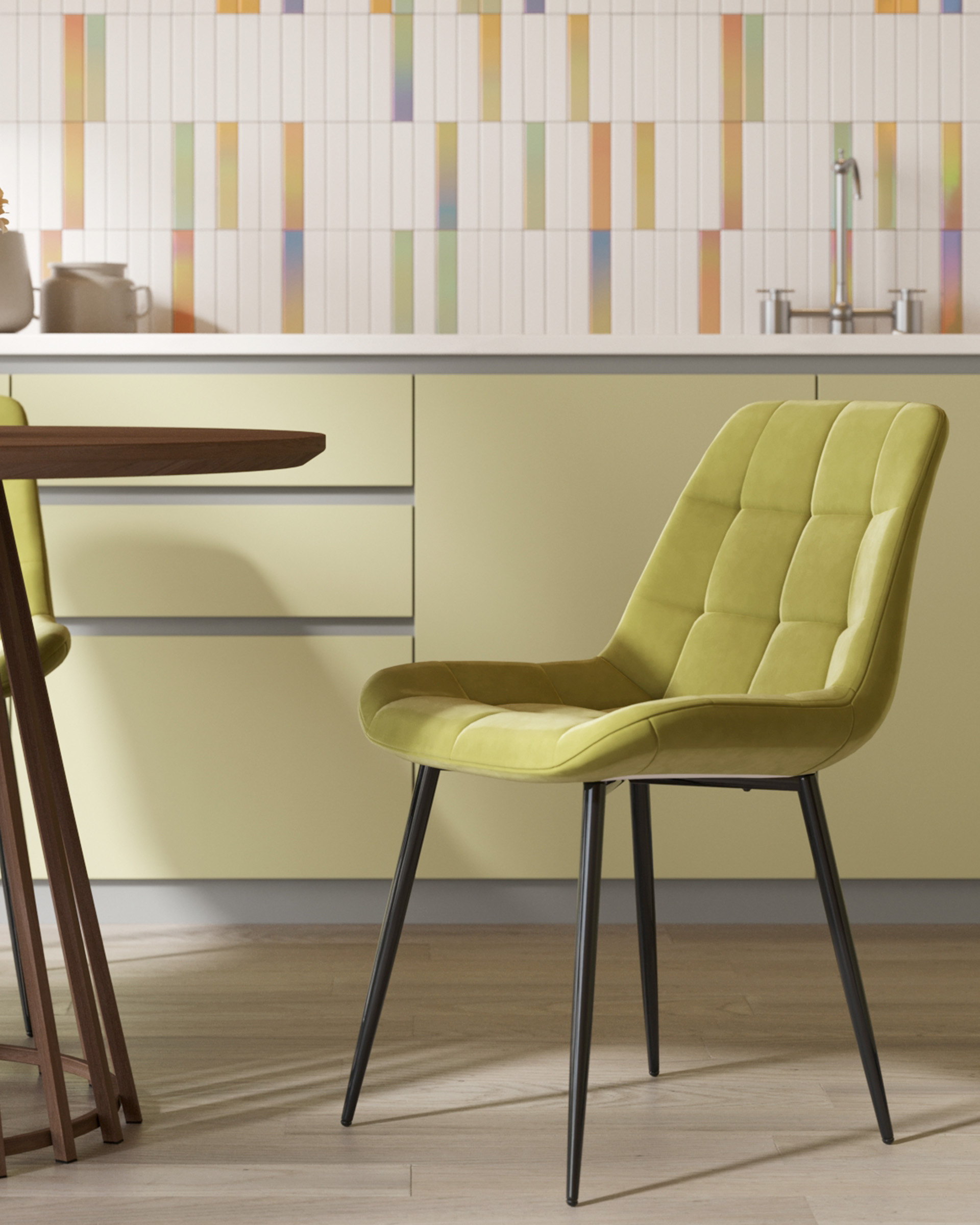 Материалы и дизайн. Выполнен из высококачественного велюра — тактильно приятного, износостойкого и простого в уходе материала. Обивка оливкового цвета идеально сочетается с черными металлическими ножками, которые придают стулу элегантный и современный вид. Сиденье с анатомической формой гарантирует комфорт, а декоративная стяжка добавляет объём и предотвращает от появления вмятин. Стул подходит для длительного использования, не теряя своей формы и внешнего вида.