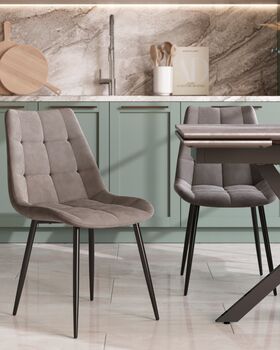 Кухонный стул в мягкой обивке из велюра без подлокотников. Анатомическая форма сиденья обеспечивает удобство, а декоративная стяжка придает объём и защищает от образования вмятин. Металлические ножки с крестовидным каркасом выдерживают значительные нагрузки. Подпятники ножек не испортят напольное покрытие и предохраняют от скольжения. Лаконичный дизайн украсит любой кухонный интерьер.