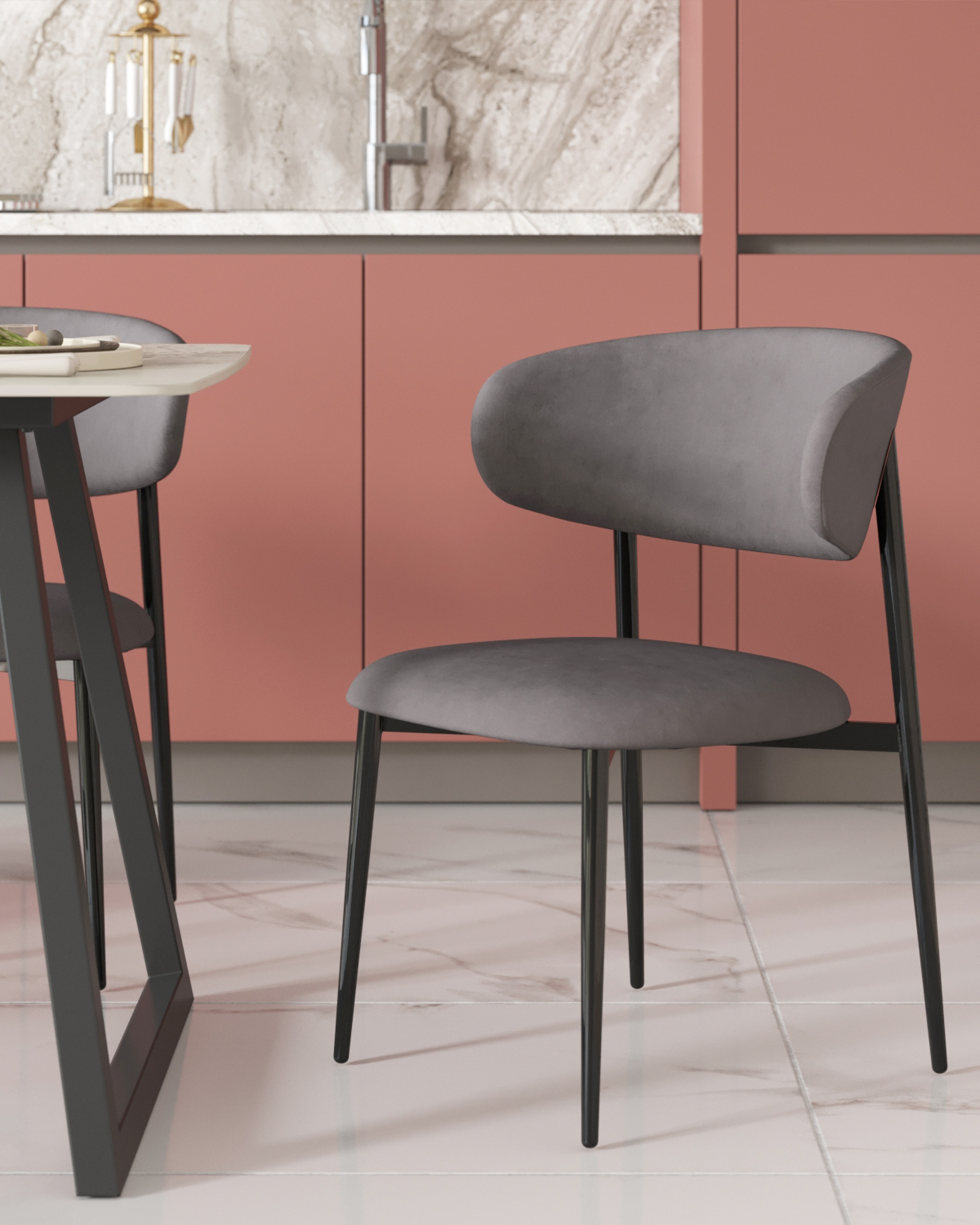 Дизайн и материалы. Стул Килиан выполнен в современном стиле, который идеально впишется в любой интерьер. Обивка сиденья и спинки выполнена из мягкого и приятного на ощупь велюра серого цвета — прочного и износостойкого материала. Каркас из металла в черном цвете добавляет элегантности и изысканности.