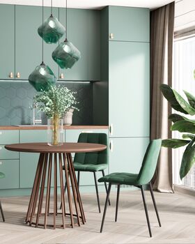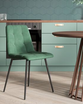 Стул Одди — это воплощение минимализма и уюта. Его обивка выполнена из мягкого велюра в элегантном зелёном цвете, который добавляет интерьеру спокойствия и сдержанного стиля. Благодаря приятной на ощупь текстуре и объемной квадратной простежке, спинка и сиденье выглядят уютно и стильно одновременно.