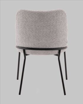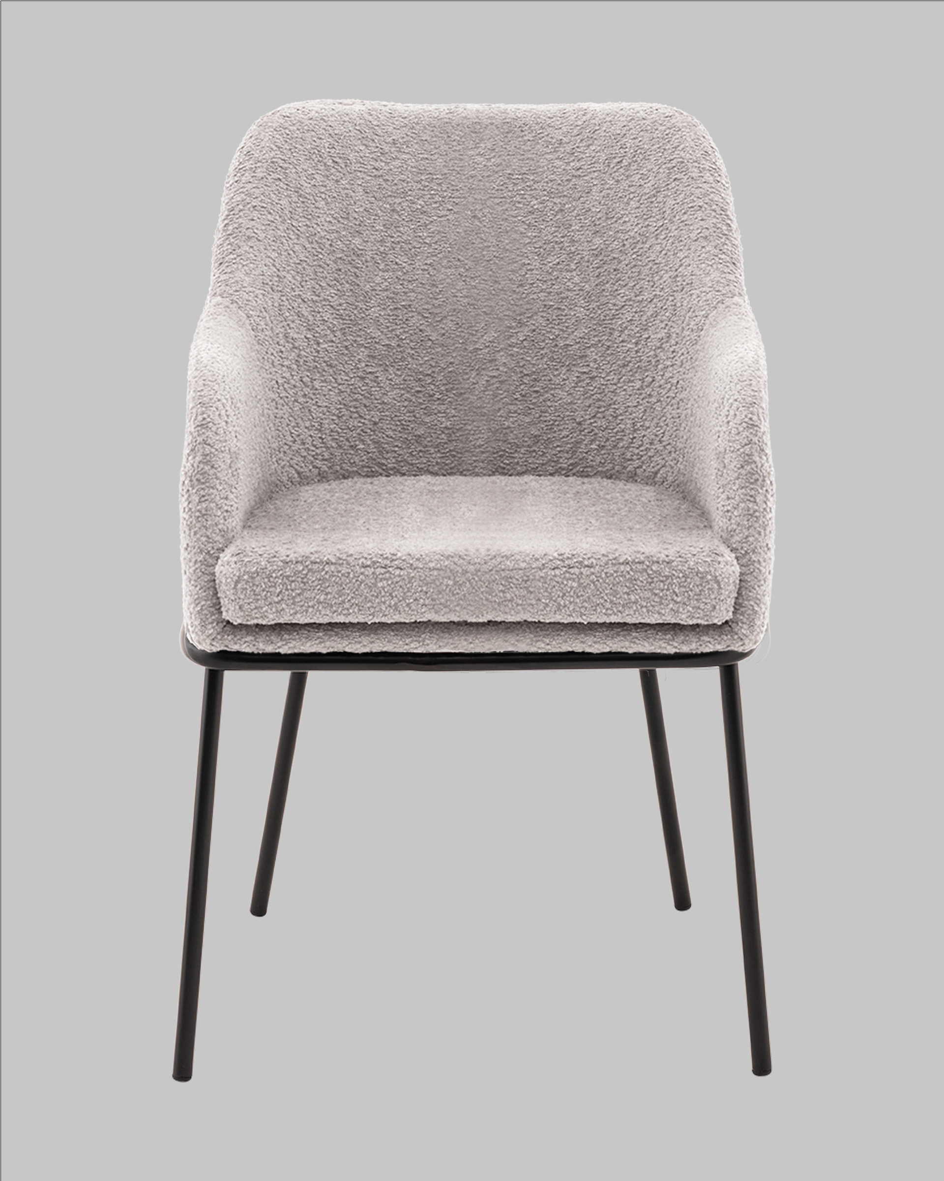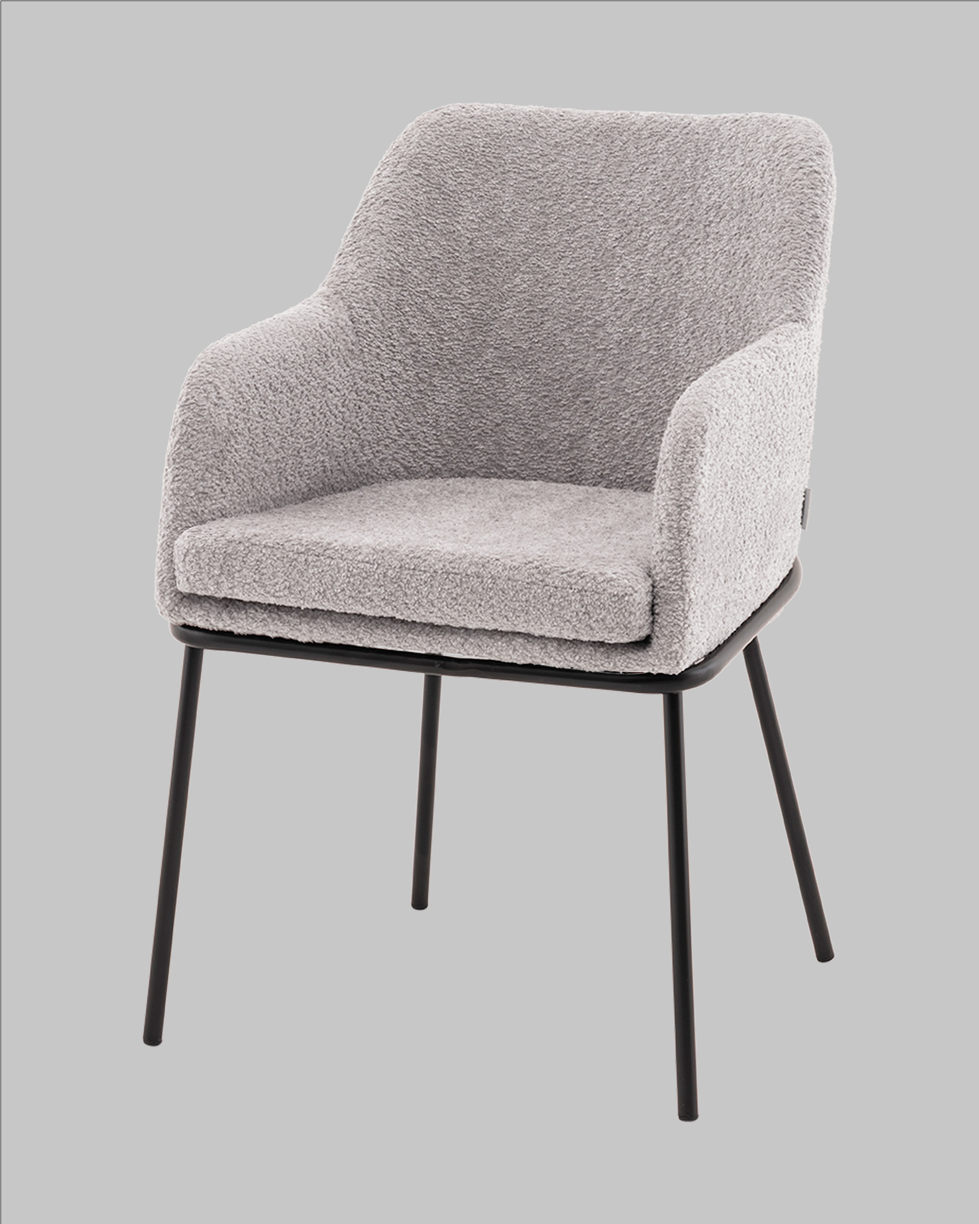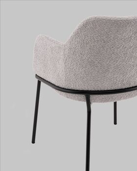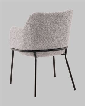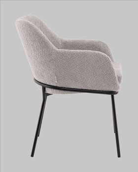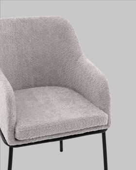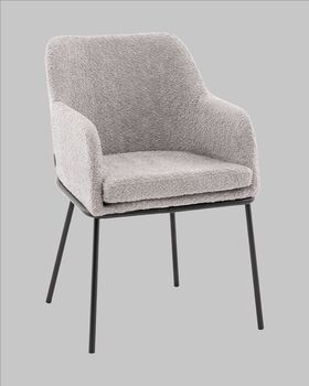 Стул с подлокотниками Кози — это сочетание мягких форм и обволакивающего комфорта. Обивка из нежной ткани букле в сером цвете добавляет интерьеру уюта и визуального тепла, а округлая форма спинки и подлокотников будто приглашает присесть и расслабиться. Чёрный металлический каркас подчёркивает графичность силуэта и придаёт модели современный акцент.
