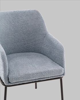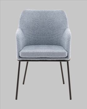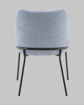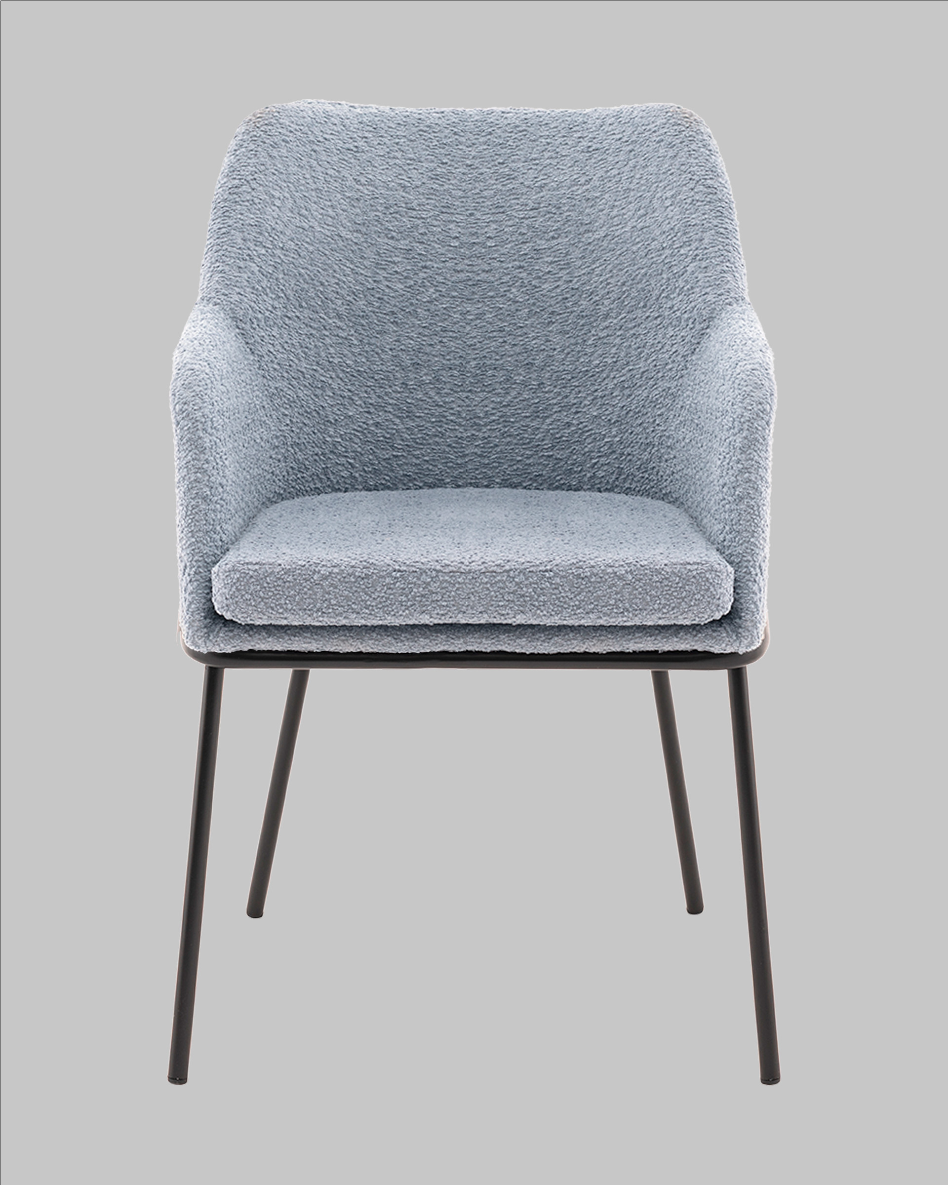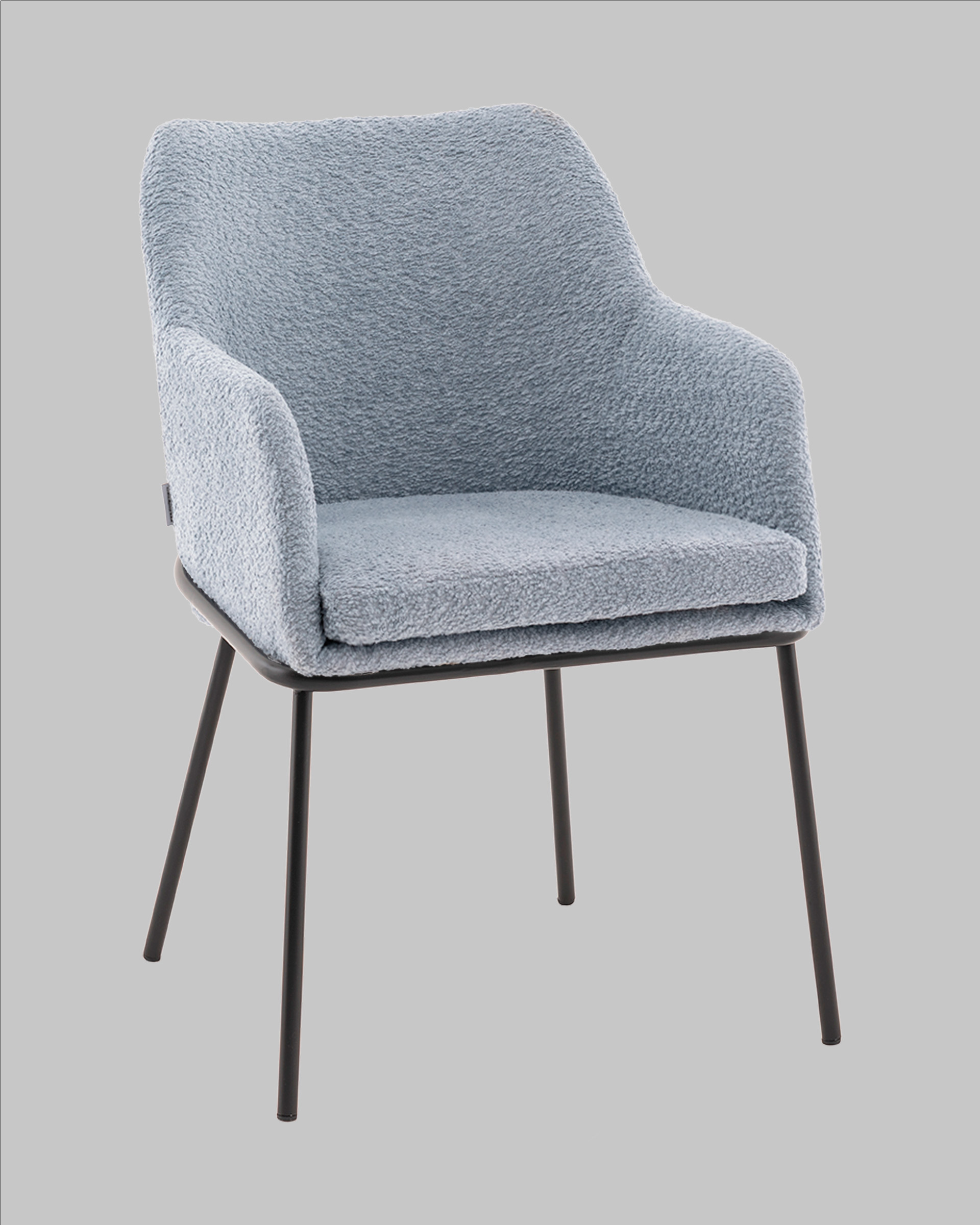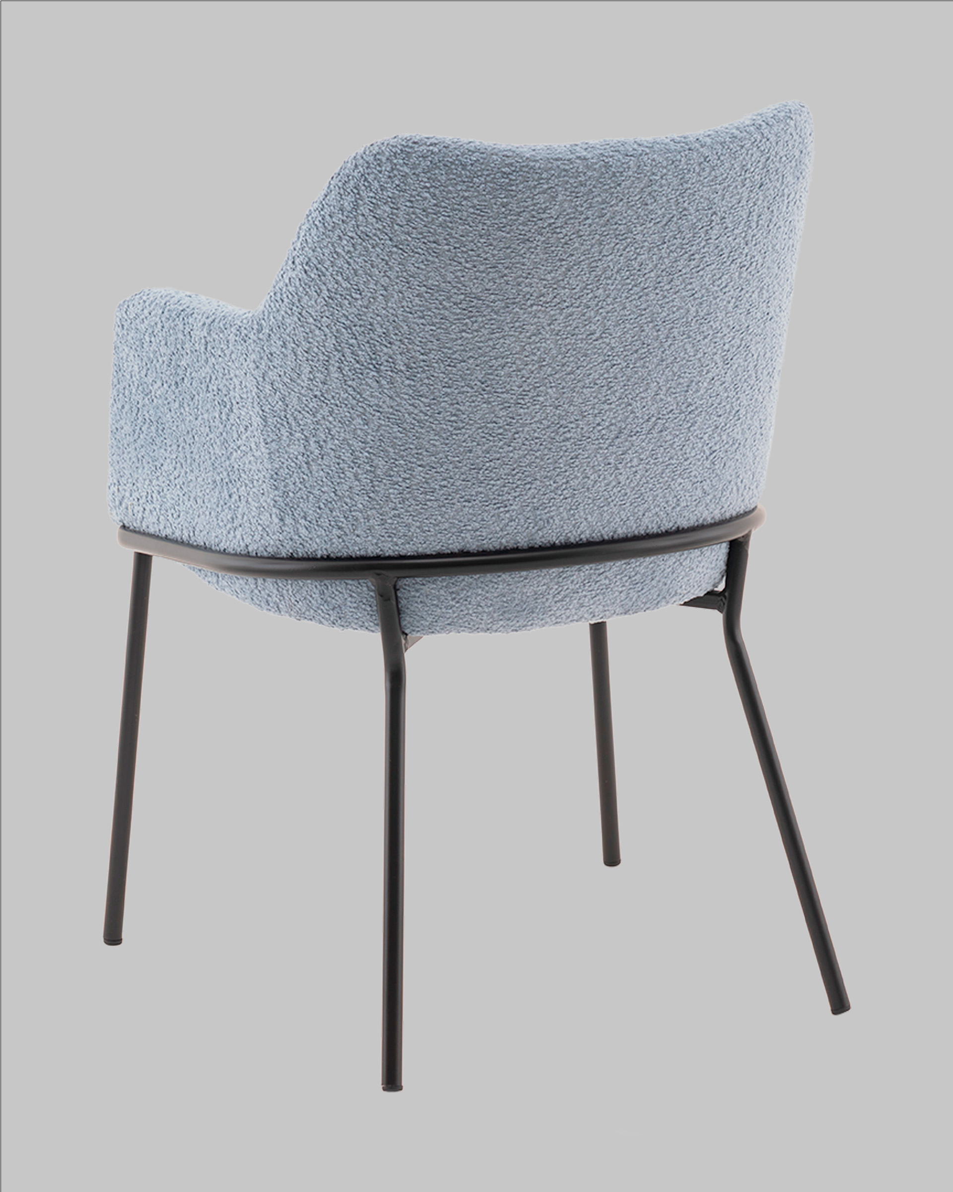 Стул с подлокотниками Кози — это сочетание мягких форм и обволакивающего комфорта. Обивка из нежной ткани букле в синем цвете добавляет интерьеру уюта и визуального тепла, а округлая форма спинки и подлокотников будто приглашает присесть и расслабиться. Чёрный металлический каркас подчёркивает графичность силуэта и придаёт модели современный акцент.
