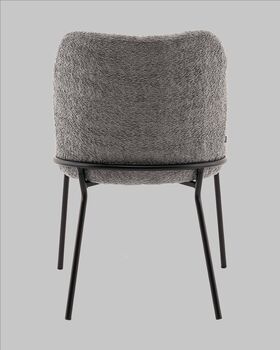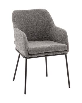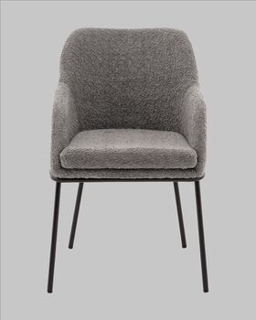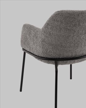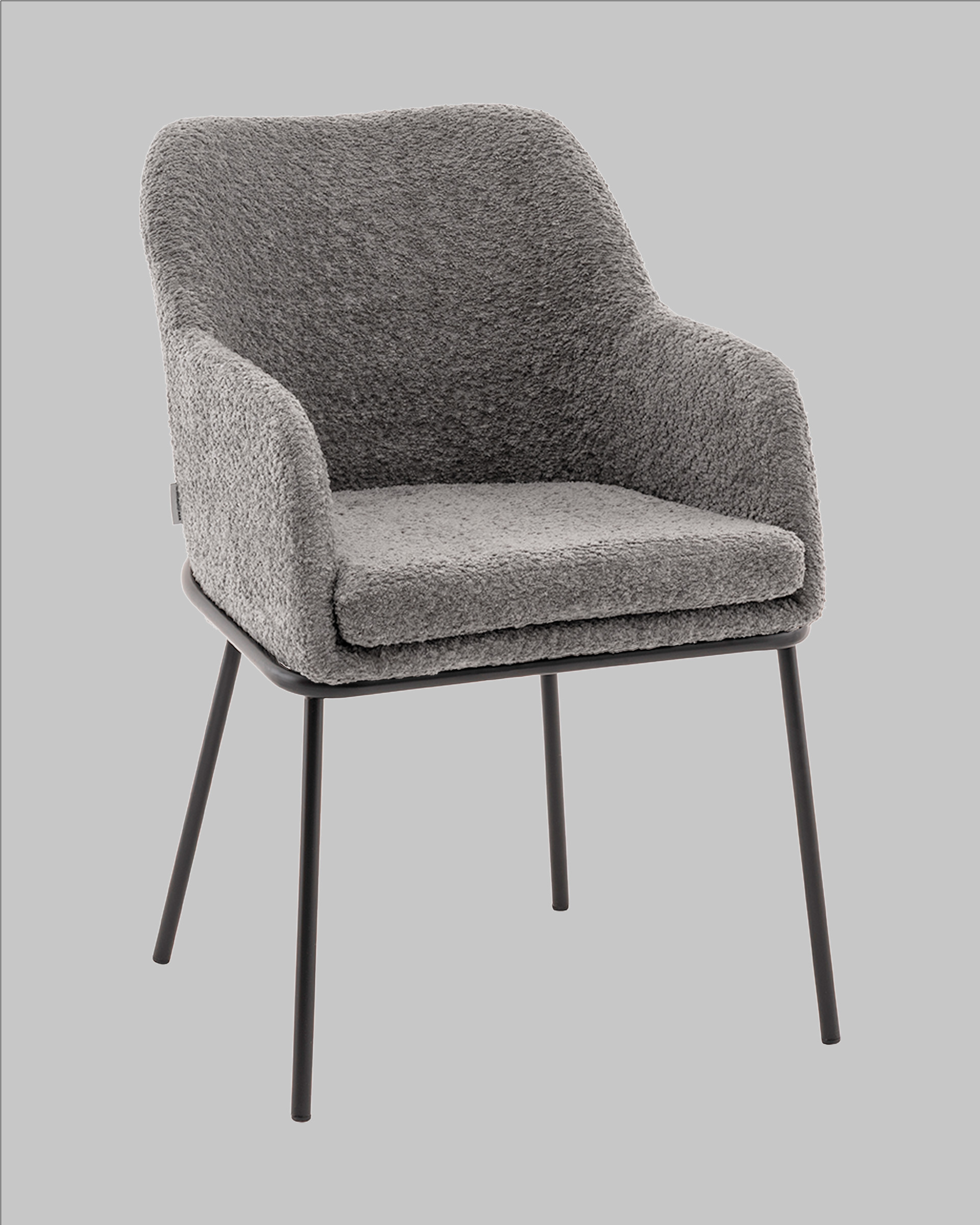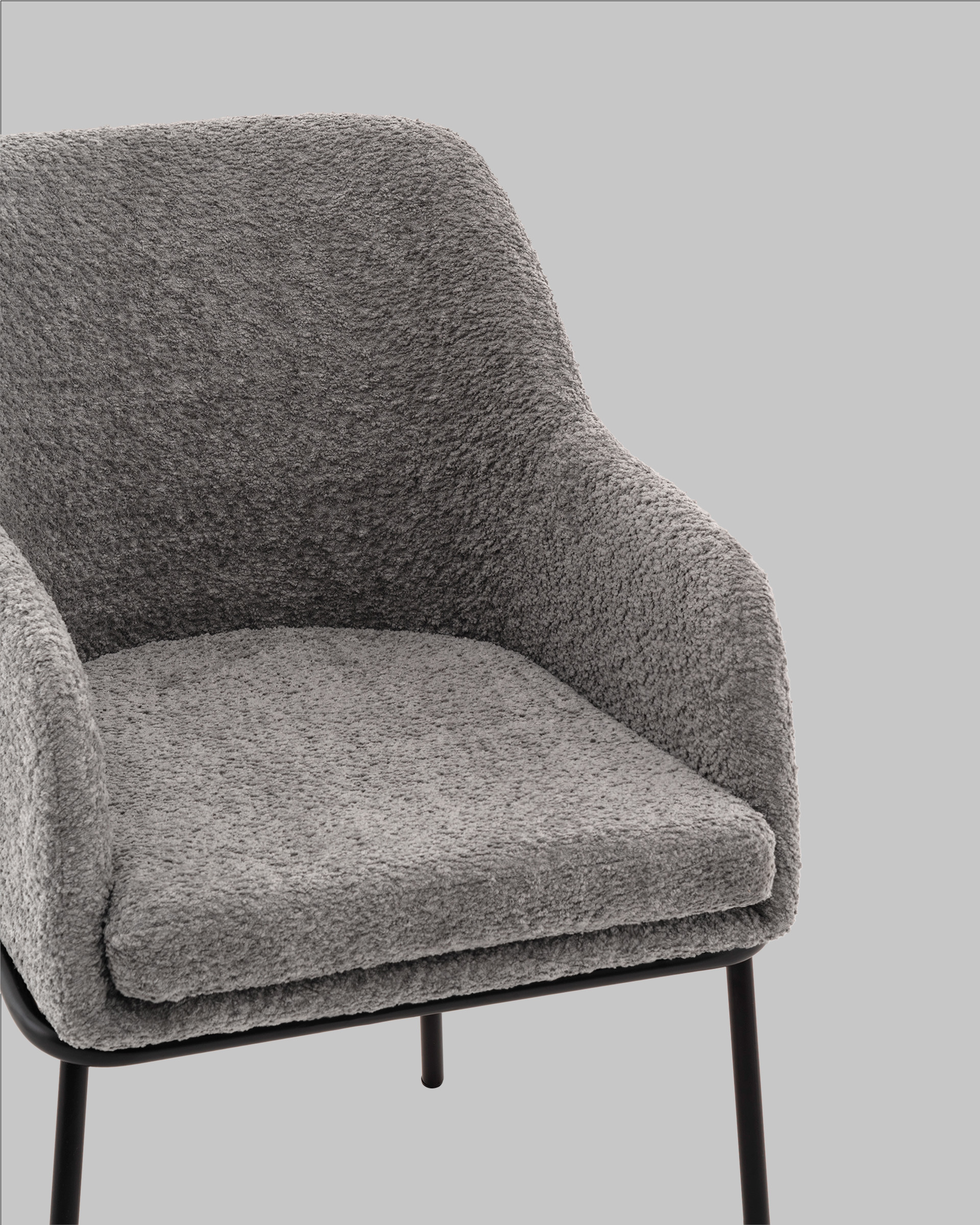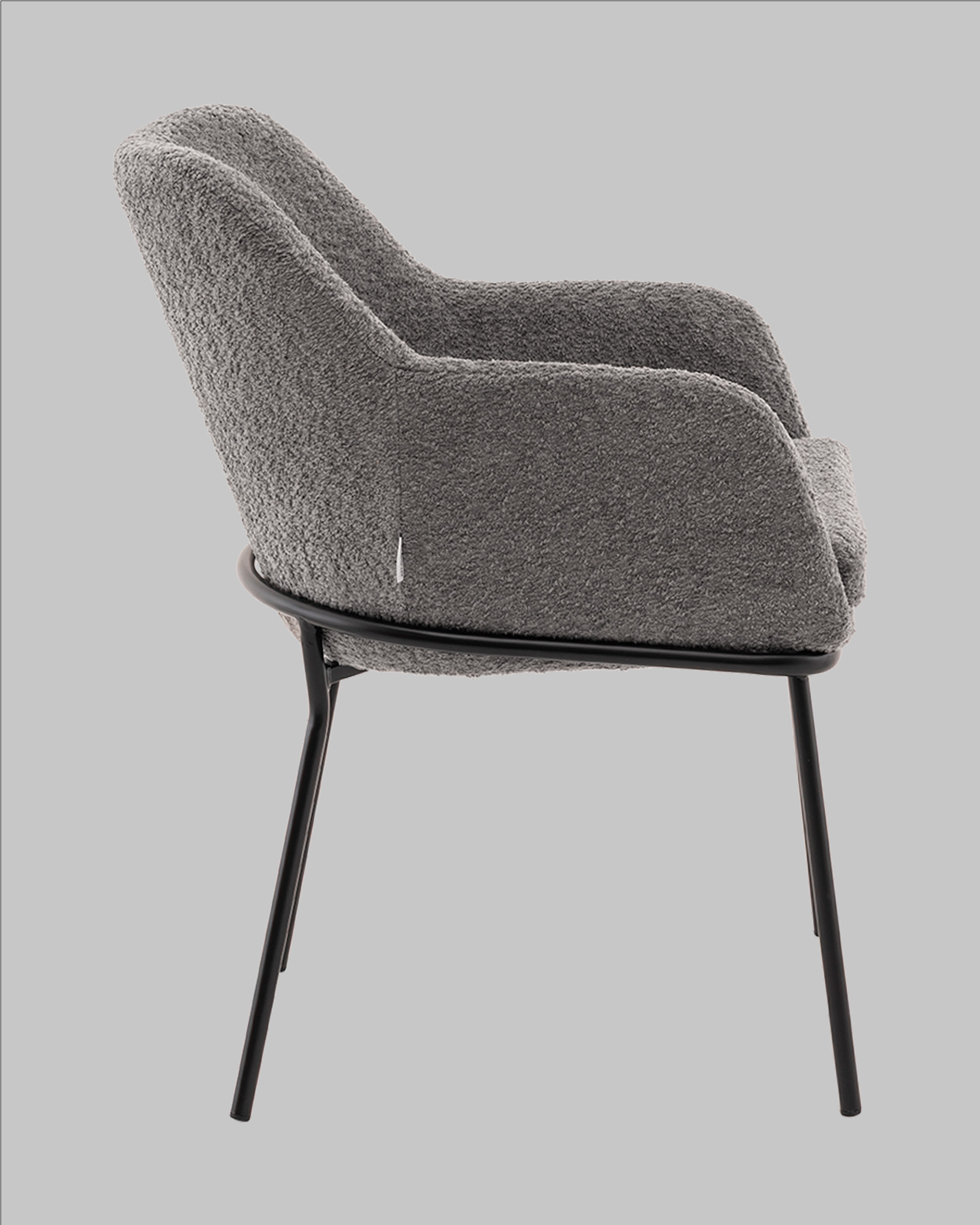 Стул с подлокотниками Кози — это сочетание мягких форм и обволакивающего комфорта. Обивка из нежной ткани букле в тёмно-сером цвете добавляет интерьеру уюта и визуального тепла, а округлая форма спинки и подлокотников будто приглашает присесть и расслабиться. Чёрный металлический каркас подчёркивает графичность силуэта и придаёт модели современный акцент.