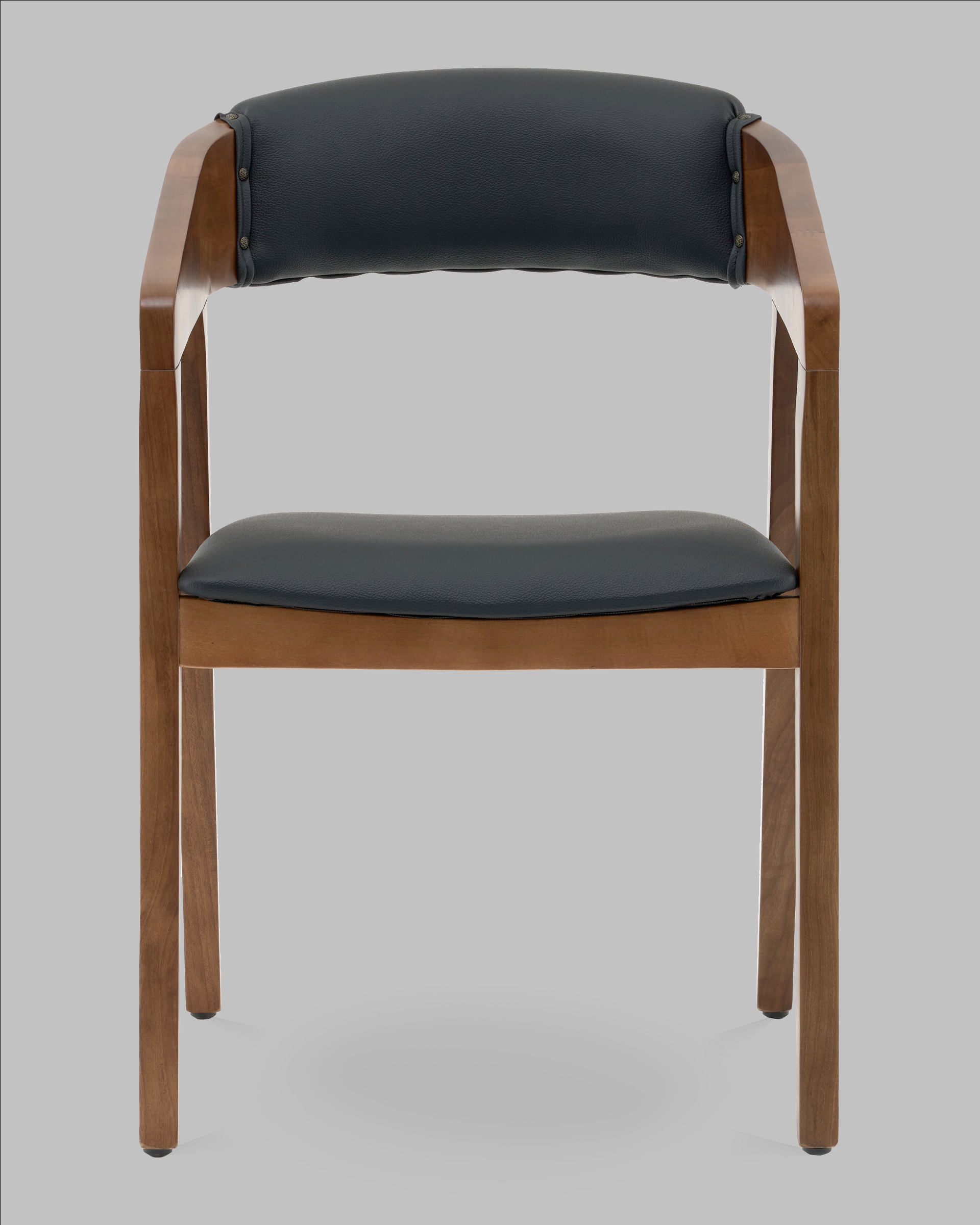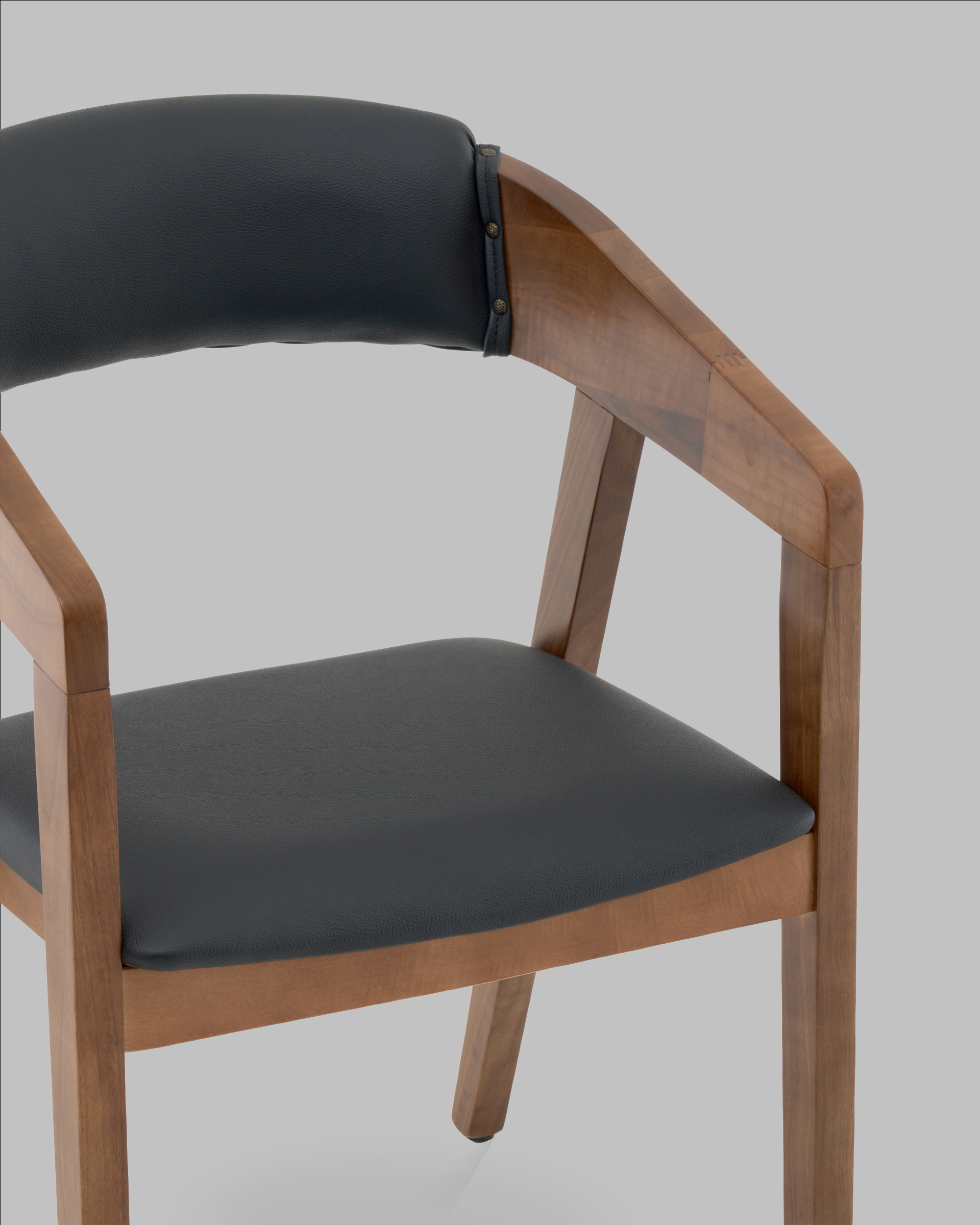 Отличительная особенность — оригинальная спинка с накладкой из чёрной экокожи. Мягкая вставка фиксируется декоративными элементами, создавая интересный акцент и усиливая характер изделия. Это не только стильный элемент, но и дополнительный комфорт для спины.