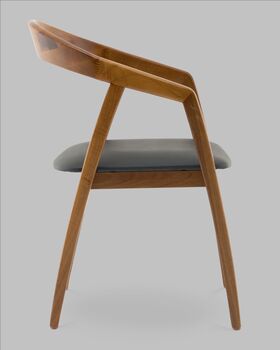 Изогнутая спинка и плавные линии подлокотников визуально облегчают конструкцию и создают ощущение невесомости. Наклонные задние ножки и тонкие передние стойки придают дизайну динамику и подчёркивают баланс между прочностью и визуальной лёгкостью.