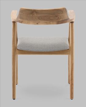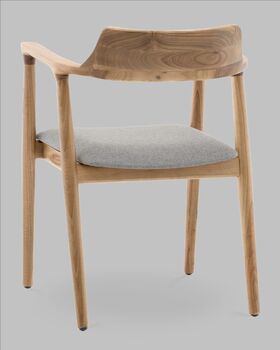 Сиденье обито светло-серой рогожкой с выразительной фактурой. Этот материал приятный на ощупь, износостойкий и отлично смотрится в интерьере. Светлый цвет сиденья создаёт контраст с тёплым тоном дерева, делая дизайн особенно свежим и современным.