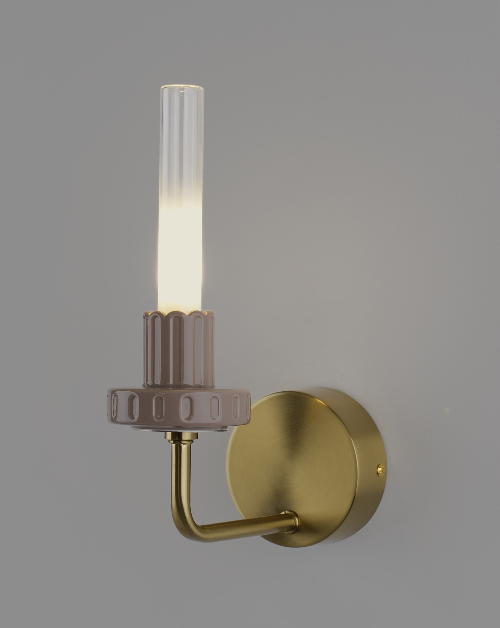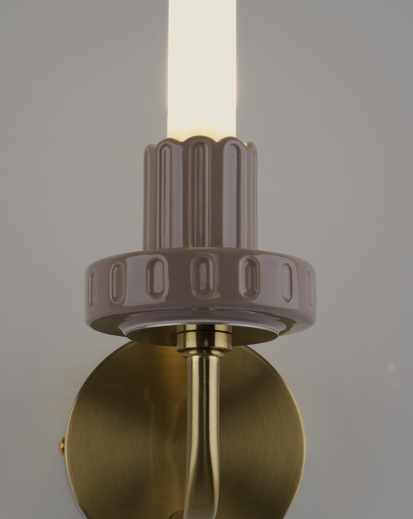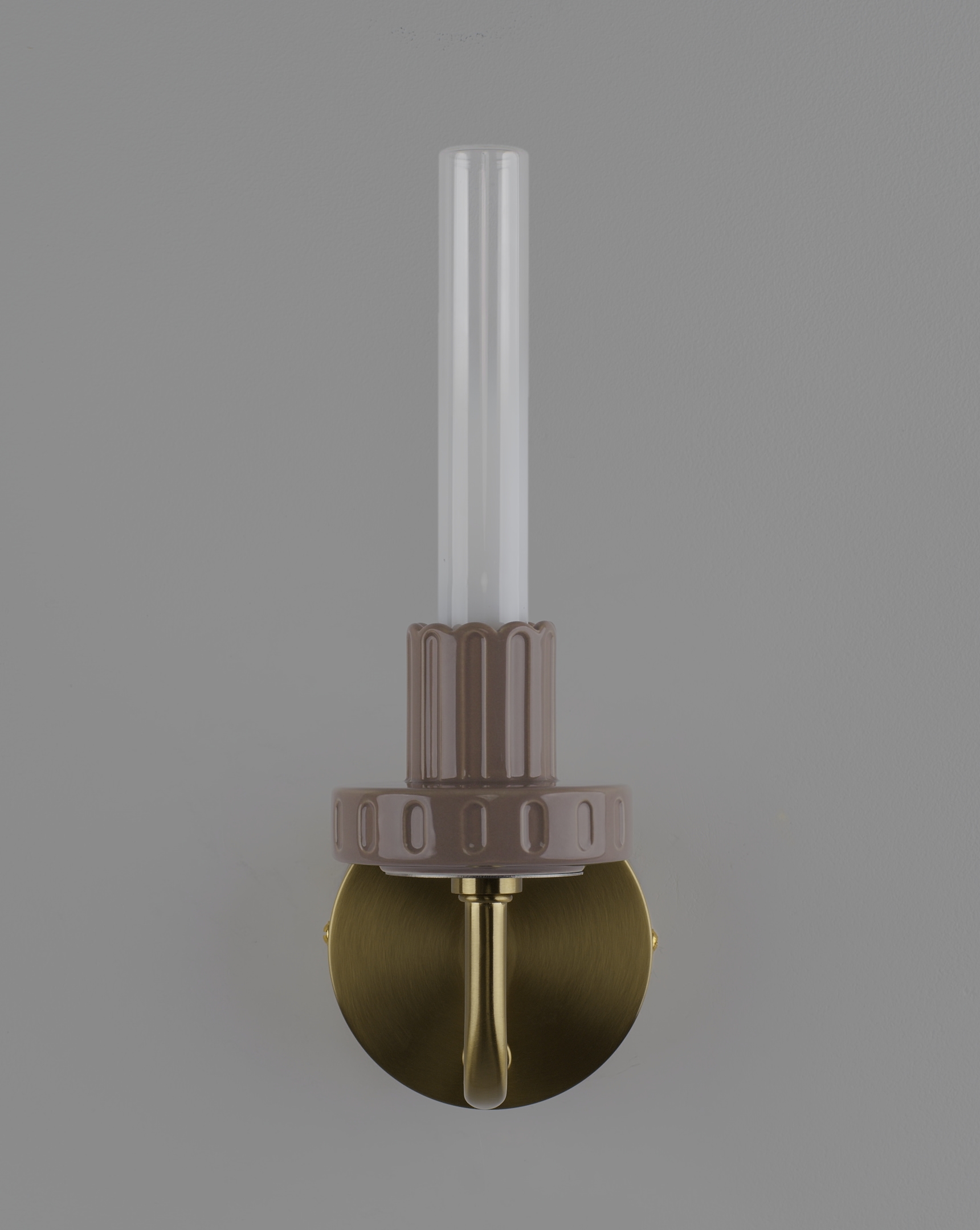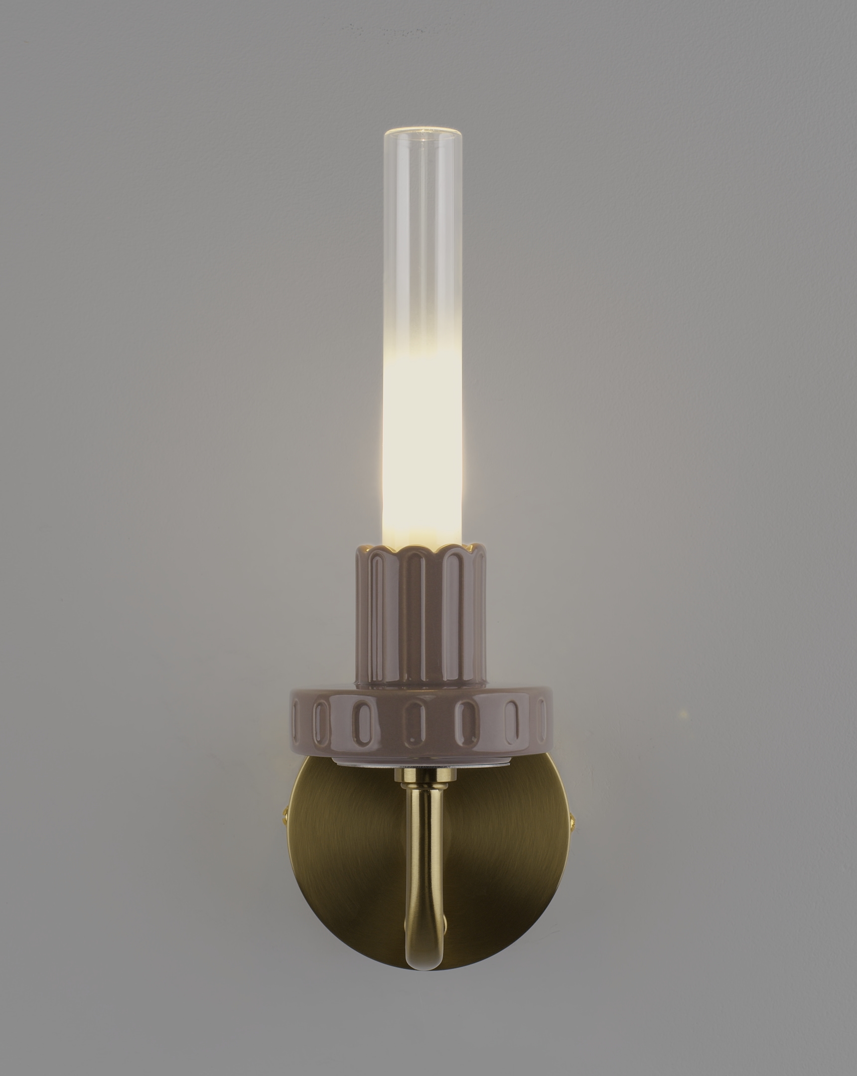 Комбинация материалов и текстур Корпус выполнен из прочного металла с благородным бронзовым покрытием. Внимание привлекает декоративный коричневый элемент из керамики с рельефной текстурой, добавляющий выразительность и индивидуальность. Прозрачный стеклянный плафон цилиндрической формы придаёт лёгкость общей конструкции.