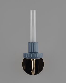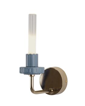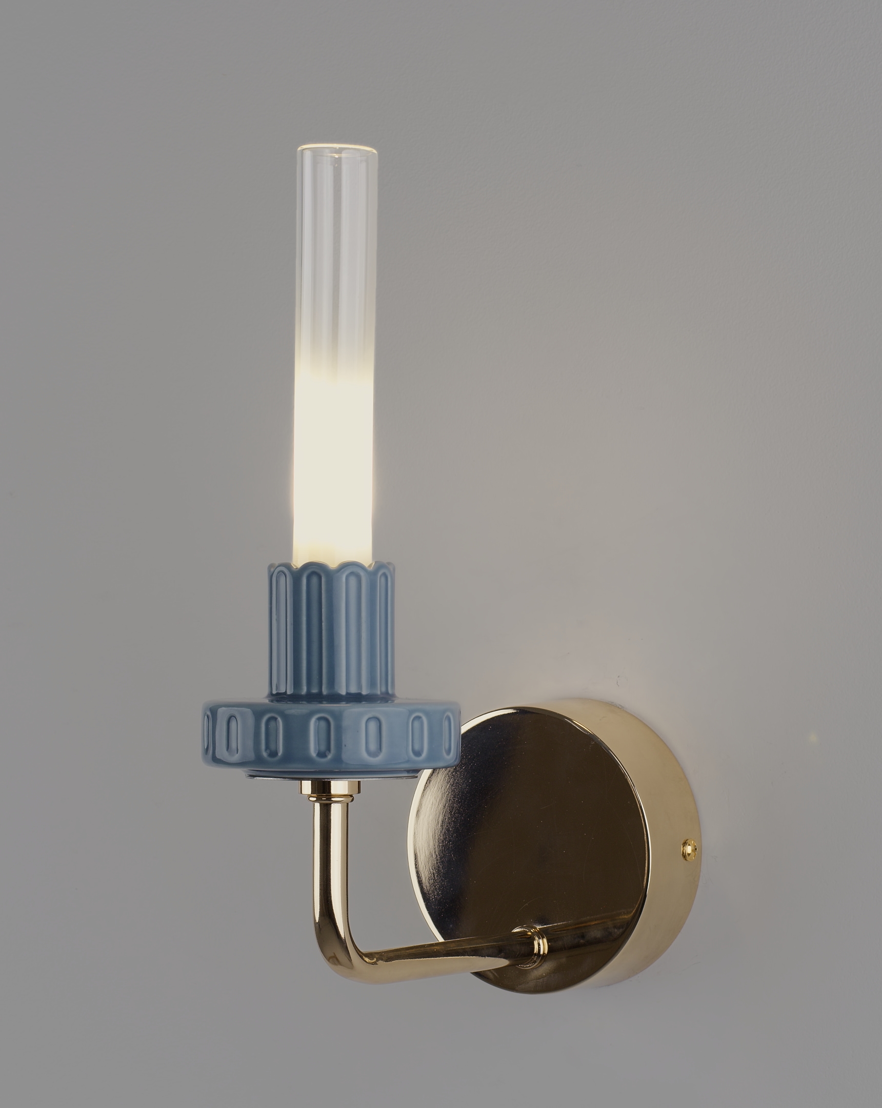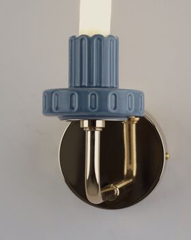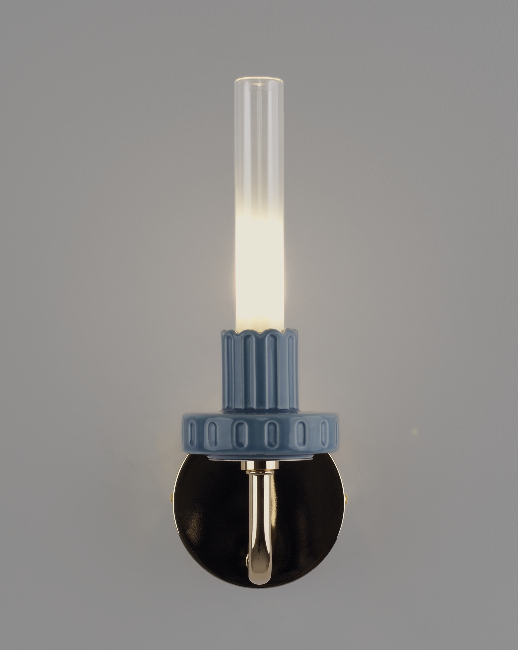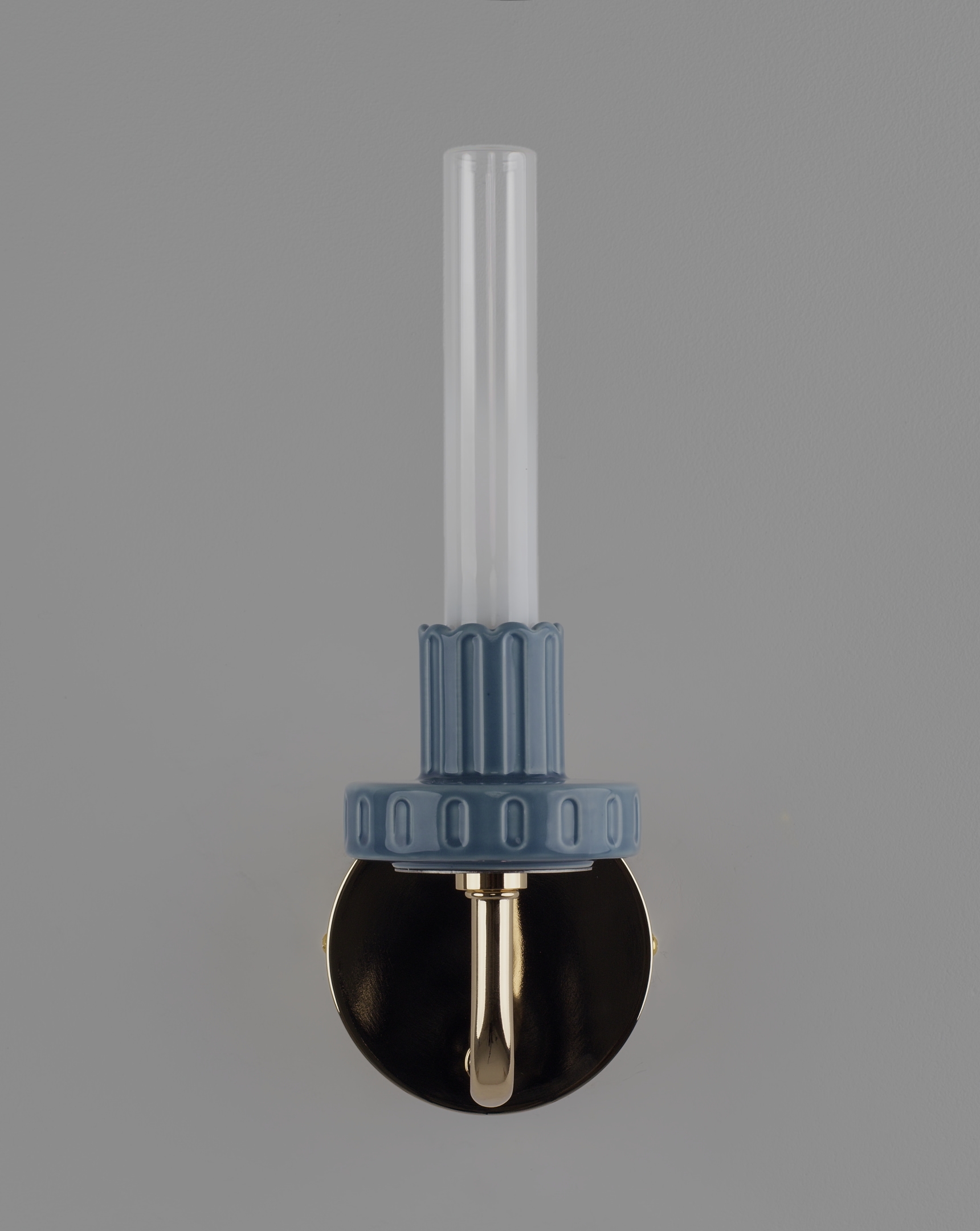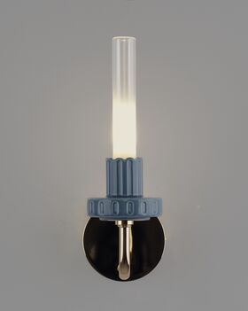 Комбинация материалов и текстур Корпус выполнен из прочного металла с благородным золотым покрытием. Внимание привлекает декоративный голубой элемент из керамики с рельефной текстурой, добавляющий выразительность и индивидуальность. Прозрачный стеклянный плафон цилиндрической формы придаёт лёгкость общей конструкции.