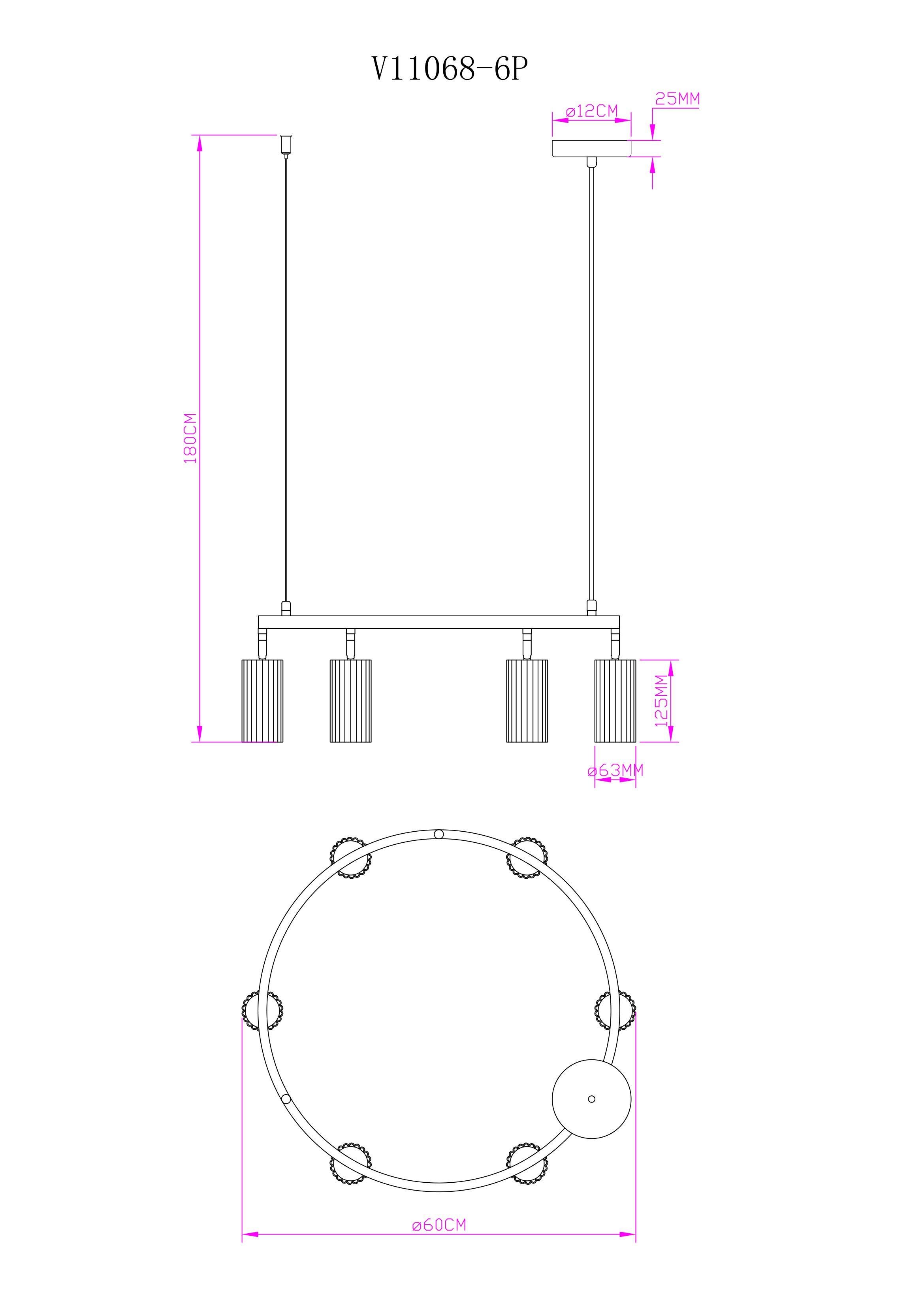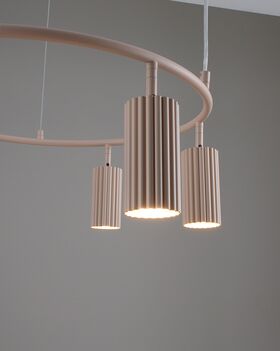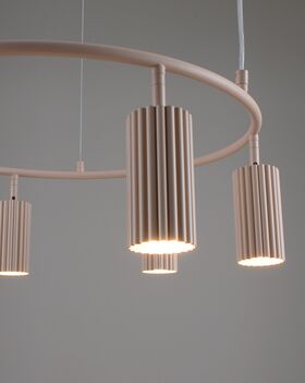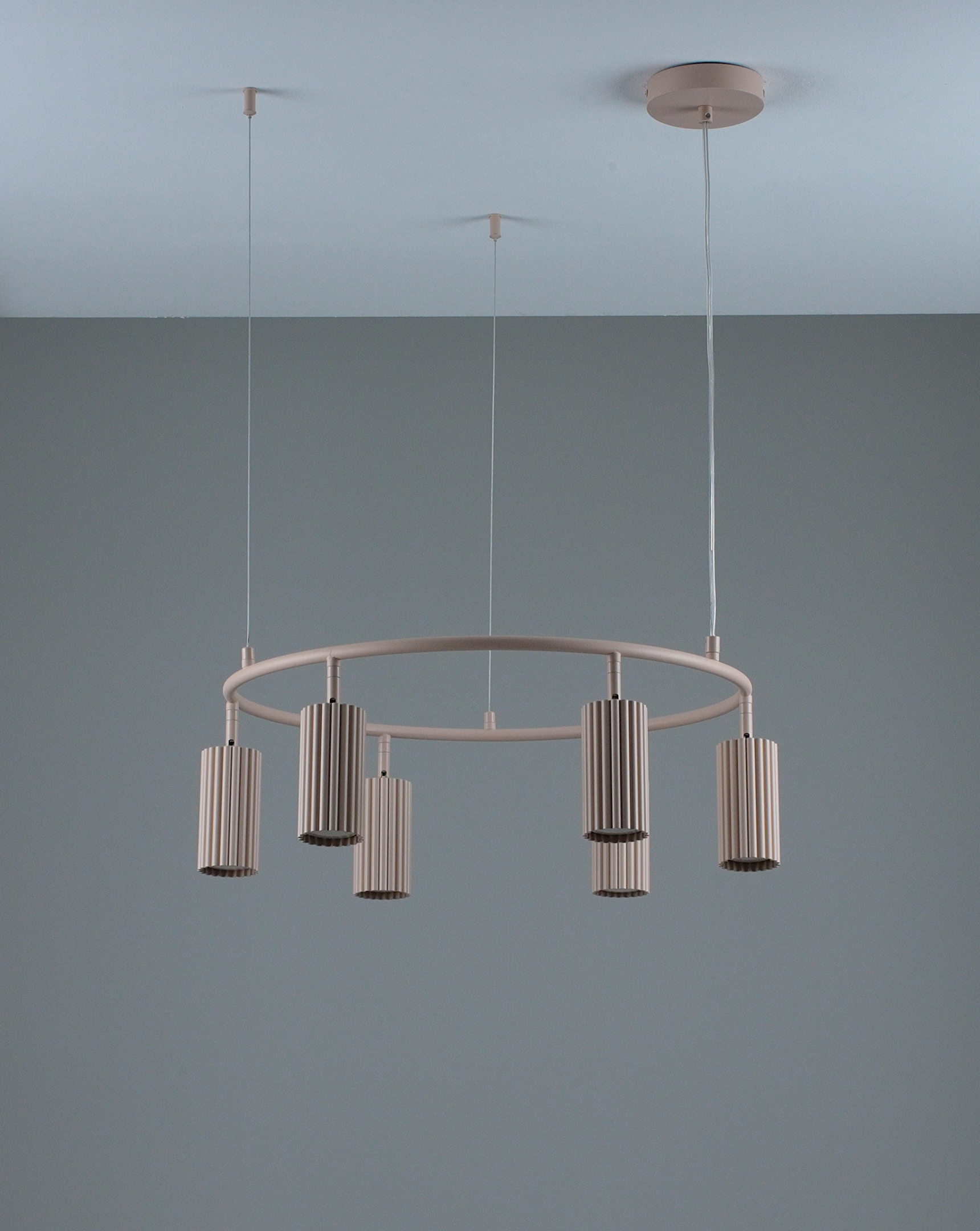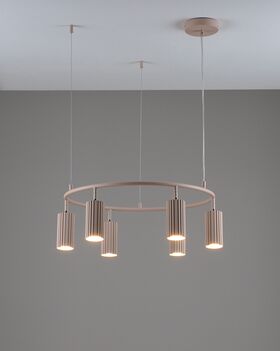 Современная подвесная люстра из серии Cora в розовом цвете. В качестве источника света подойдут лампы с цоколем GU10. Металлический каркас длиной 60 см охватывают значительную площадь для освещения. Конструкция надежно крепится к потолку на планку. Данная модель станет отличным дополнением барной или обеденной зоны.