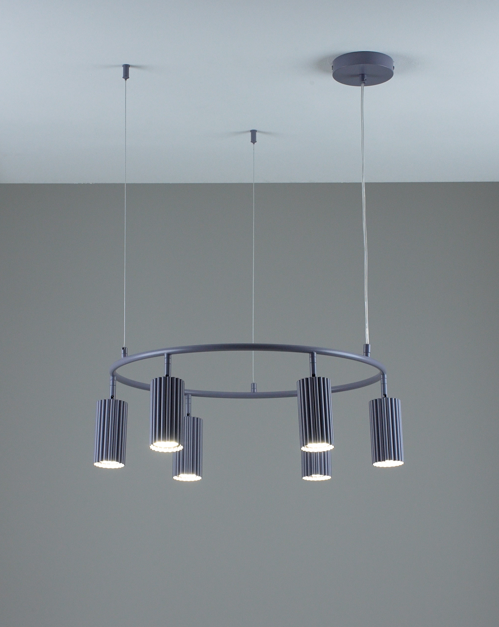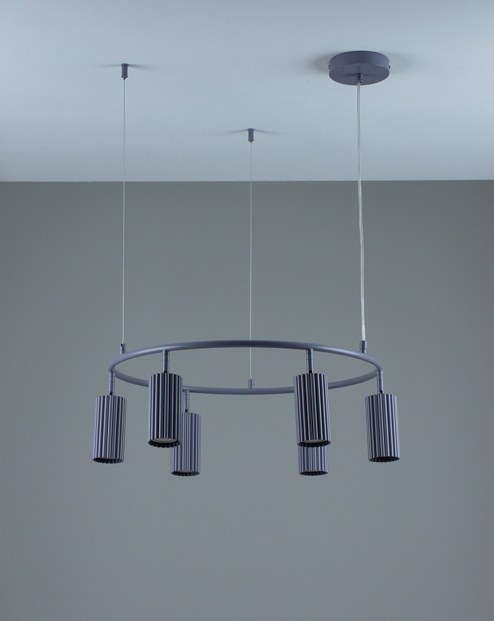 Современная подвесная люстра из серии Cora в сером цвете. В качестве источника света подойдут лампы с цоколем GU10. Металлический каркас длиной 60 см охватывают значительную площадь для освещения. Конструкция надежно крепится к потолку на планку. Данная модель станет отличным дополнением барной или обеденной зоны.