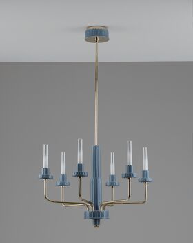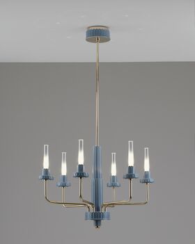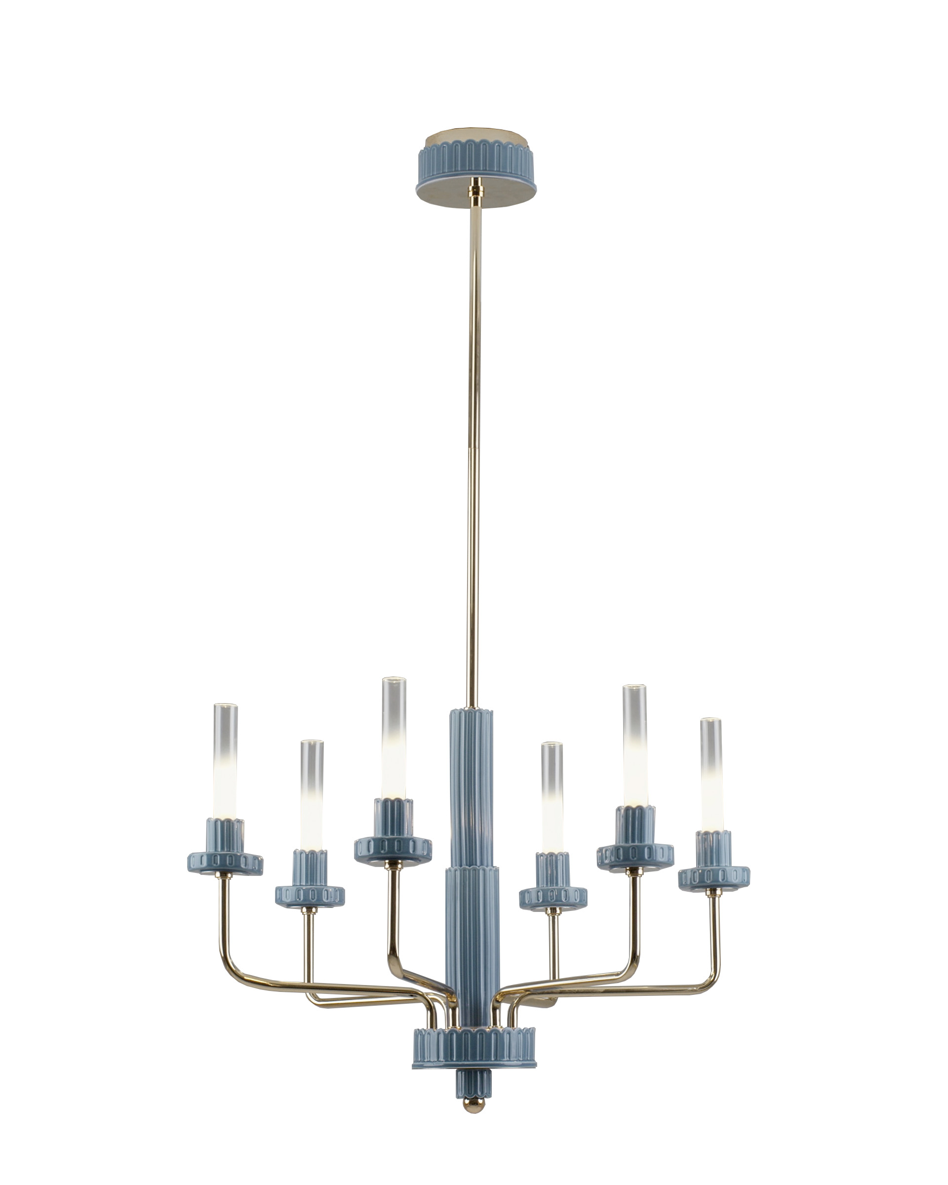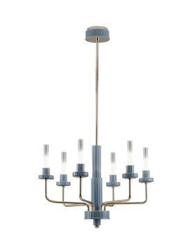 Подвесная люстра Moderli Atelieri — это гармоничное сочетание современных форм и декоративной выразительности. Шесть вытянутых цилиндрических плафонов из прозрачного стекла создают визуальную лёгкость, а аккуратные декоративные элементы из керамики в голубом оттенке придают светильнику характерный акцент. Металлический корпус с благородным золотым покрытием подчёркивает элегантность дизайна и делает люстру уместной в самых разных интерьерах — от минимализма до неоклассики.