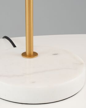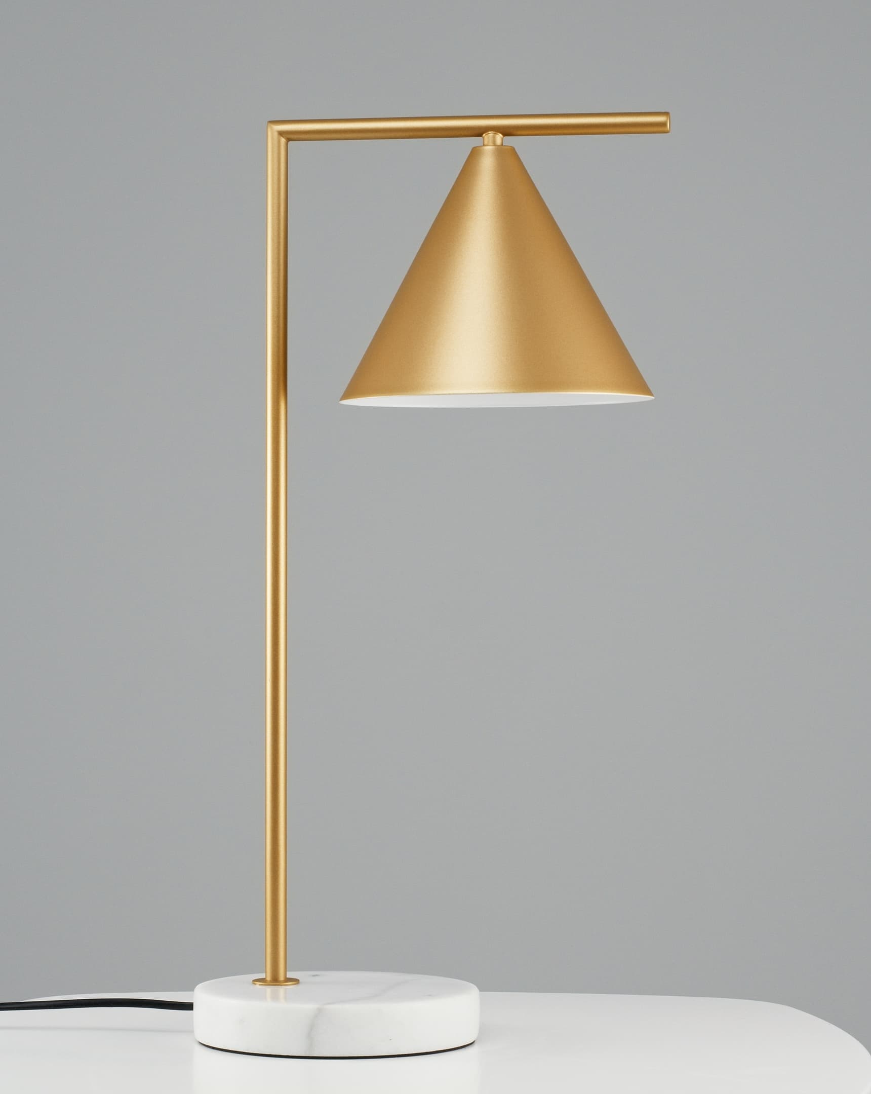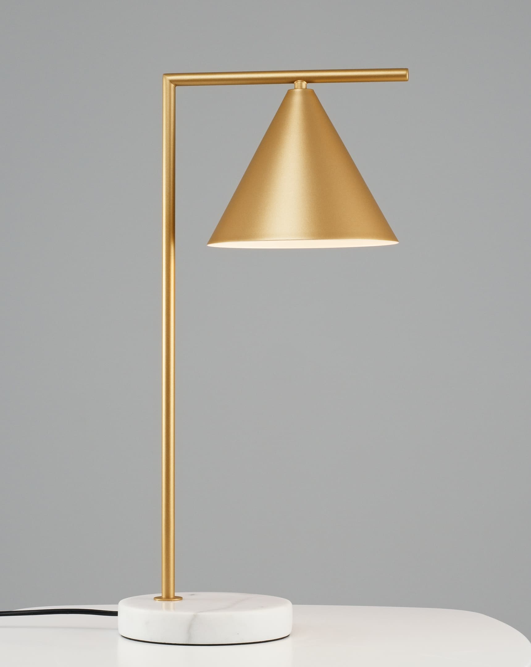 Настольная лампа Omaha выполнена в современном стиле, сочетая элегантность и функциональность. Ее конструкция включает металлический корпус с золотистым покрытием, придающим изделию роскошный вид. Плафон в форме конуса направлен вниз, обеспечивая направленное освещение. Основание из белого мрамора не только добавляет эстетическую привлекательность, но и обеспечивает устойчивость лампы. Такое сочетание материалов и форм делает эту лампу стильным акцентом в интерьере. Прекрасное дополнение рабочего пространства в стиле лофт или модерн.