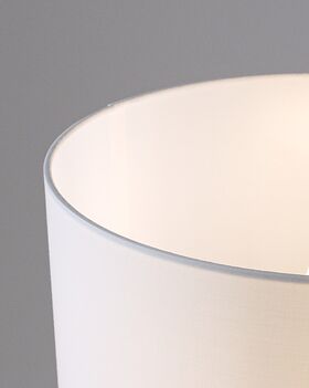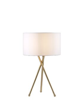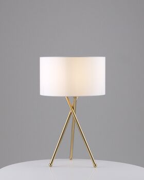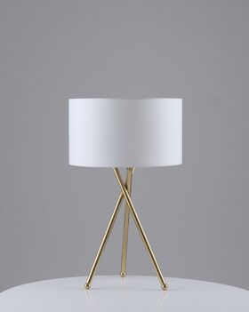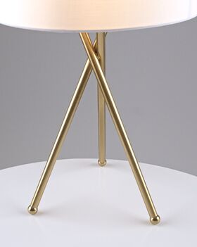 Стильная настольная лампа из серии Palma. Тканевый абажур белого цвета мягко рассеивает свет и создает приглушенное комфортное освещение. В качестве источника света подойдут лампы с цоколем Е27. Металлический каркас латунного цвета оригинальной формы и с устойчивой конструкцией дополняет дизайн лампы. Отличный вариант для украшения интерьера и создания дополнительного освещения в спальне или в зале.