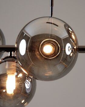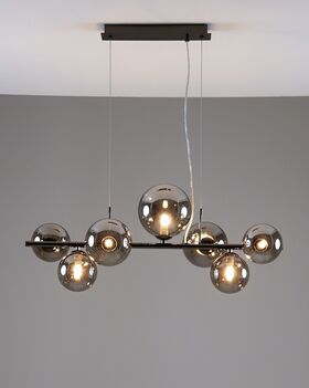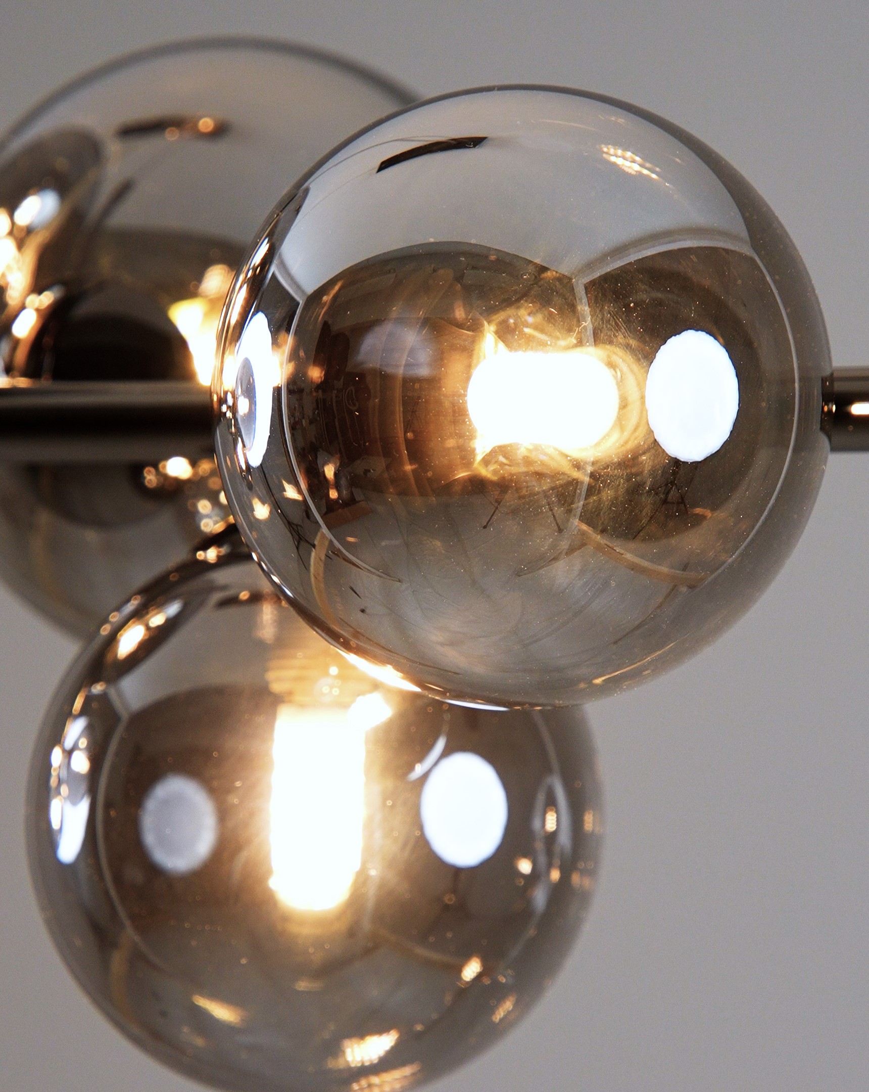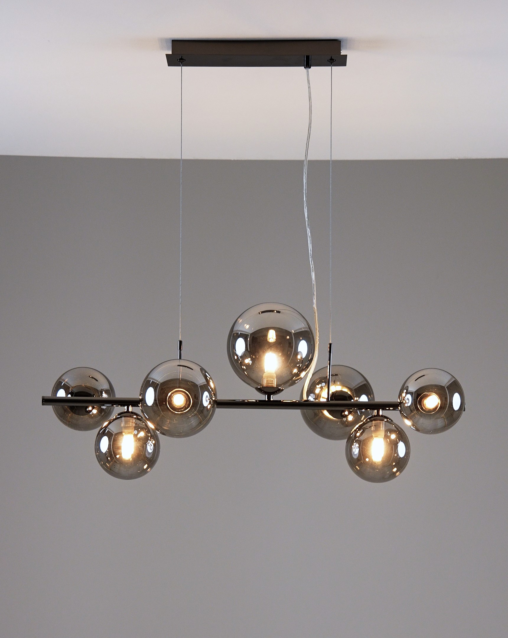 Современный подвесной светильник серии Renny. Оригинальный и лаконичный дизайн в металлическом каркасе чёрного цвета украшенный сферическими плафонами. В качестве источника света можно использовать лампы накаливания или LED с цоколем G9. Вся конструкция надежно крепится на планку. Данная модель станет отличным дополнением для кухни, холла или гостиной. При монтаже светильника, высоту можно отрегулировать.