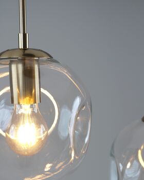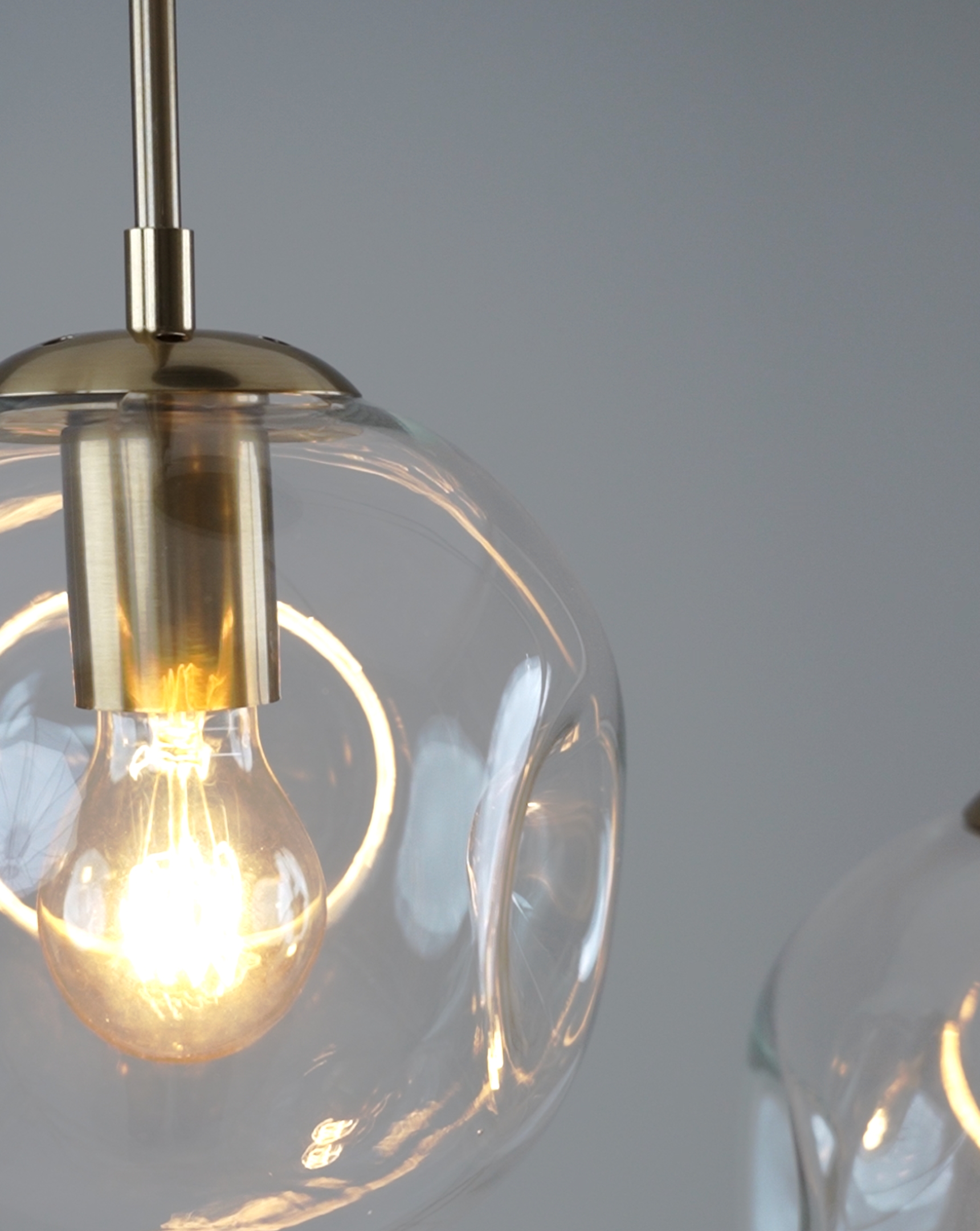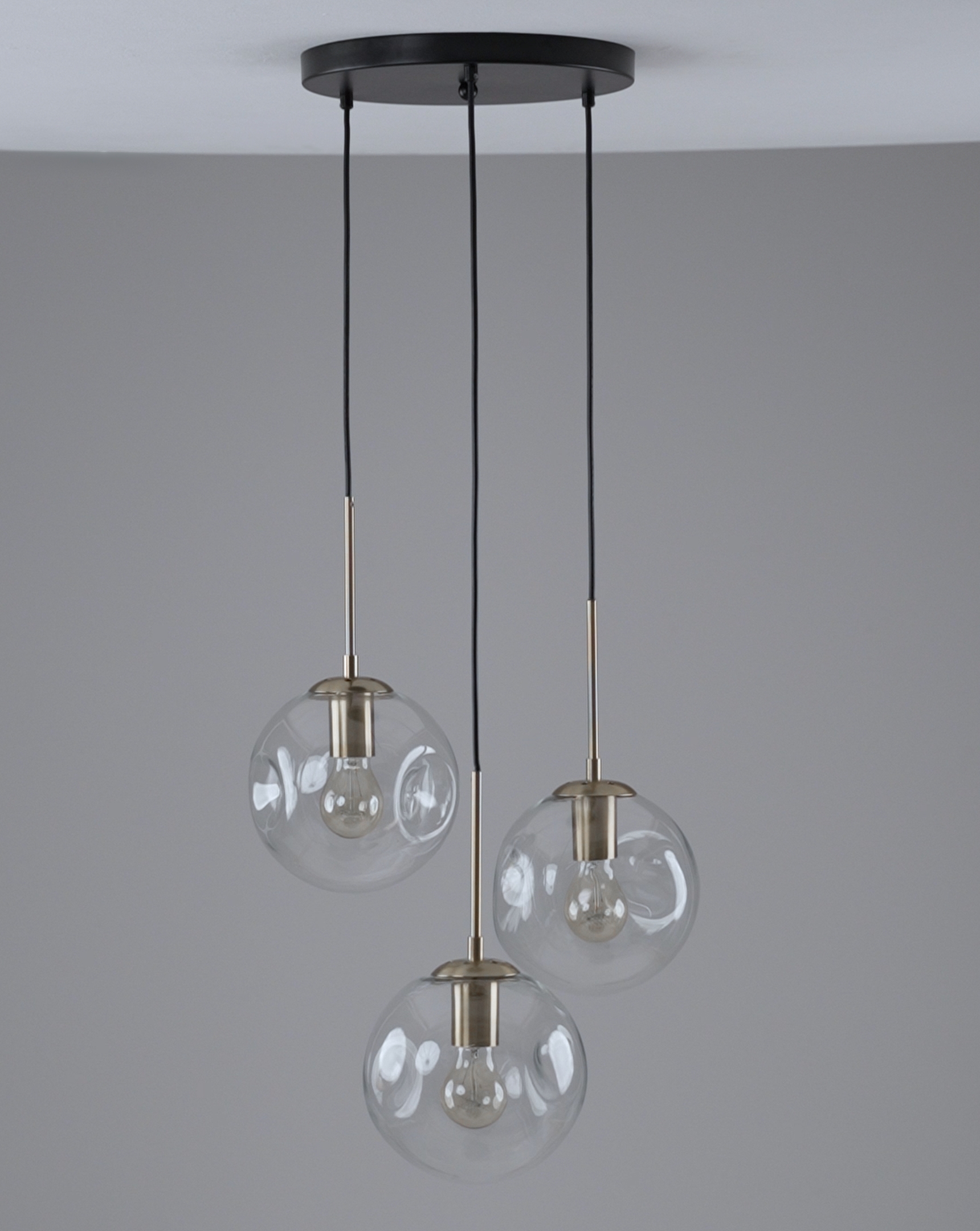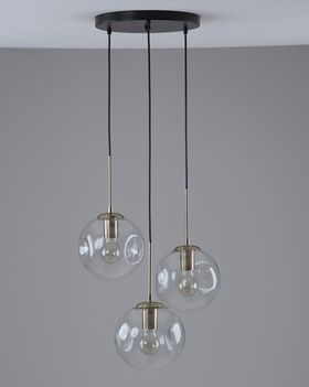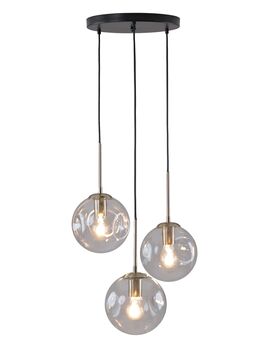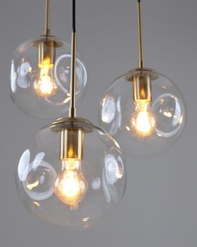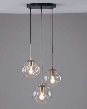 Подвесной светильник в с 3 плафонами в современном дизайне. Стеклянные плафоны диаметром 46 см обеспечат комфортное и оригинальное освещение. В качестве источника света подойдут лампы накаливания или LED с цоколем Е27. С площадью освещения 9 м? светильник подойдёт для кухни, барной или обеденной зоны и дополнит любой интерьер в современном силе. При монтаже светильника, плафоны можно отрегулировать по высоте.