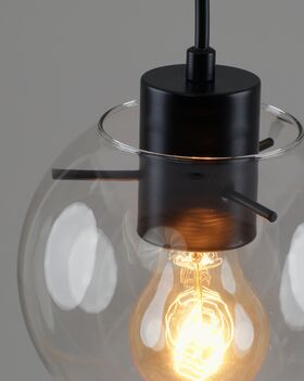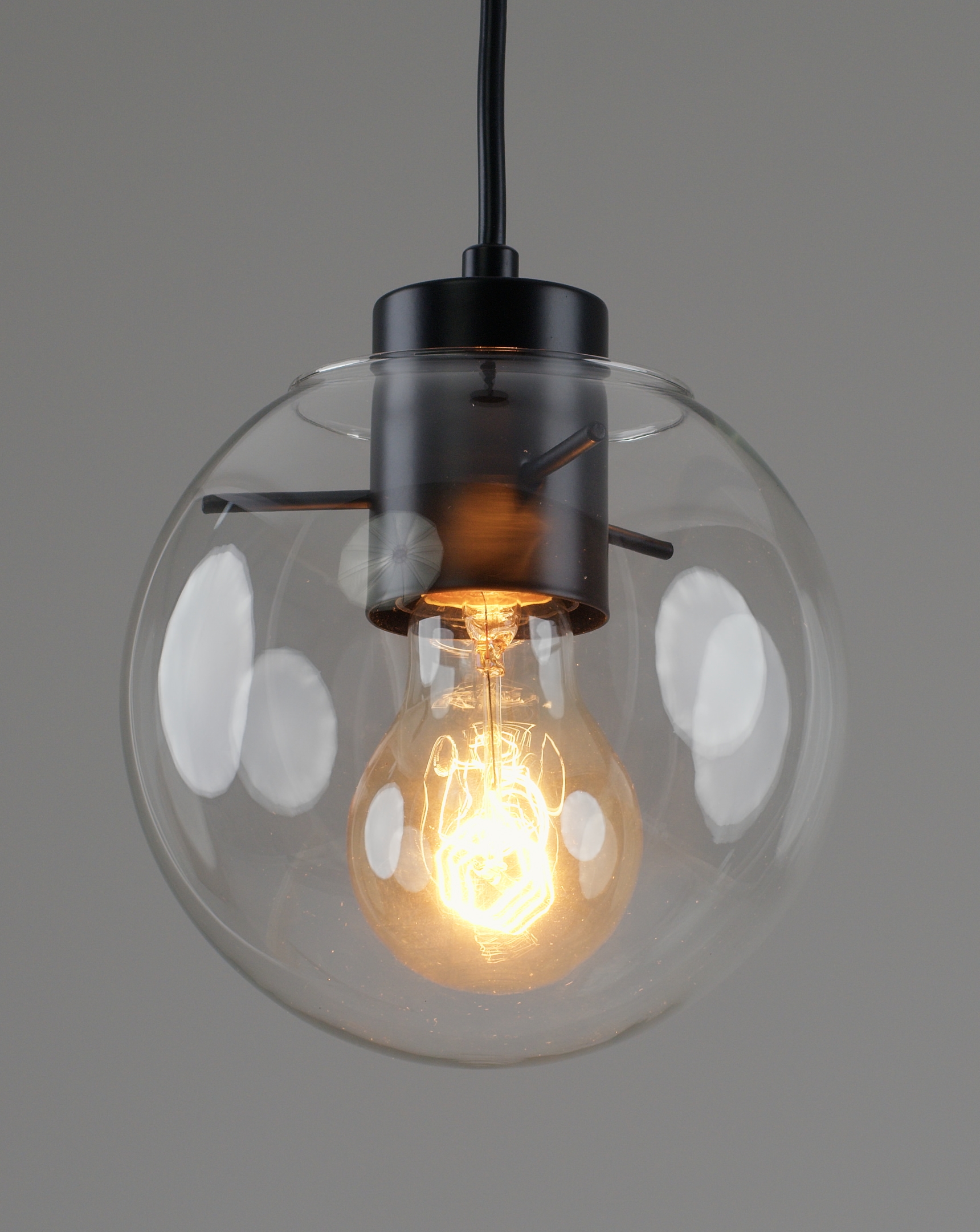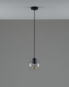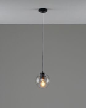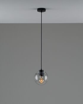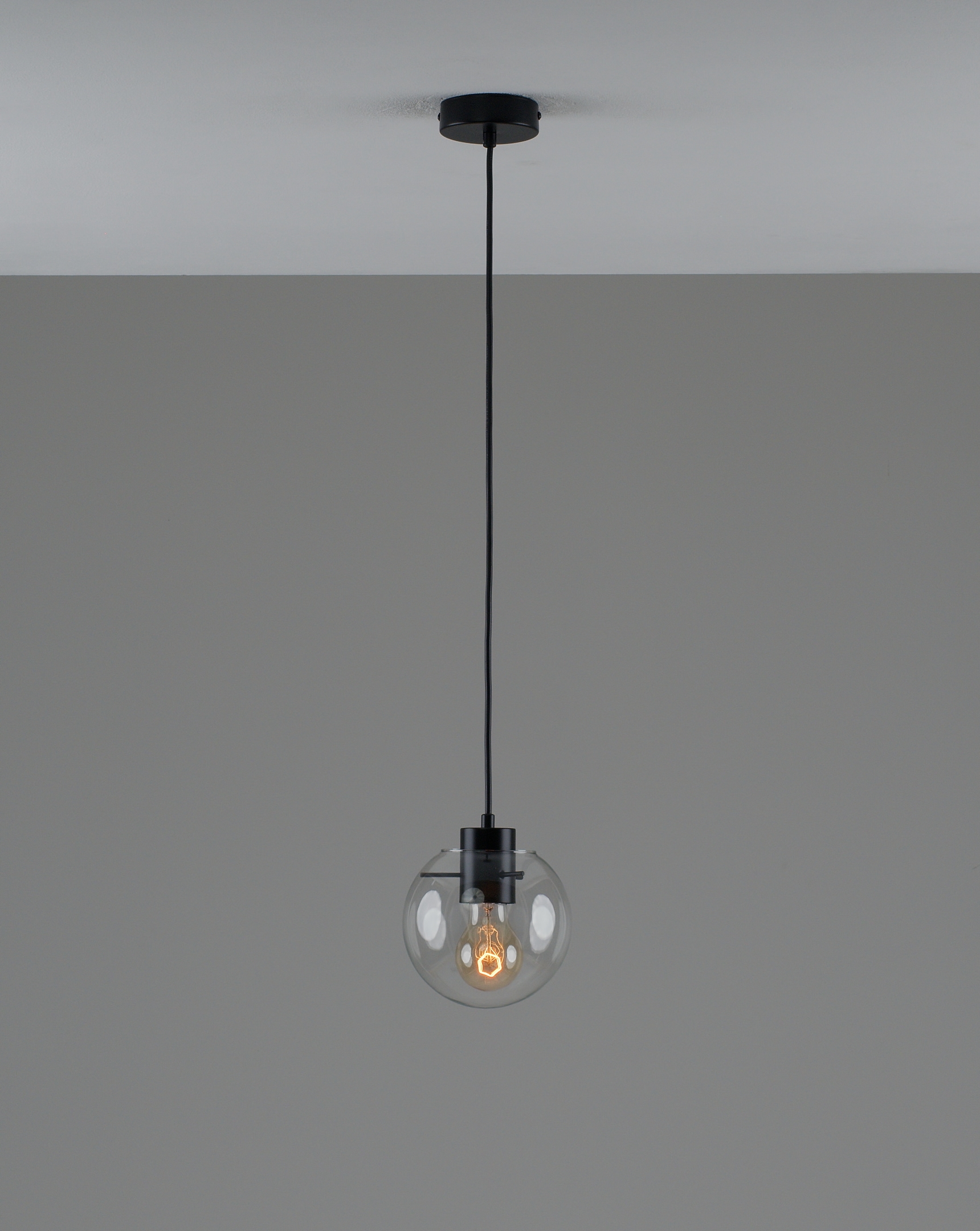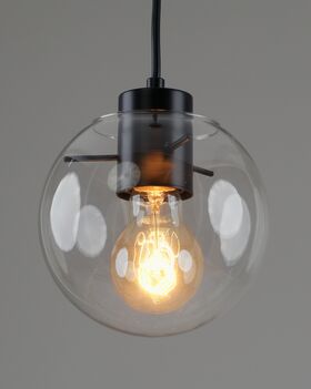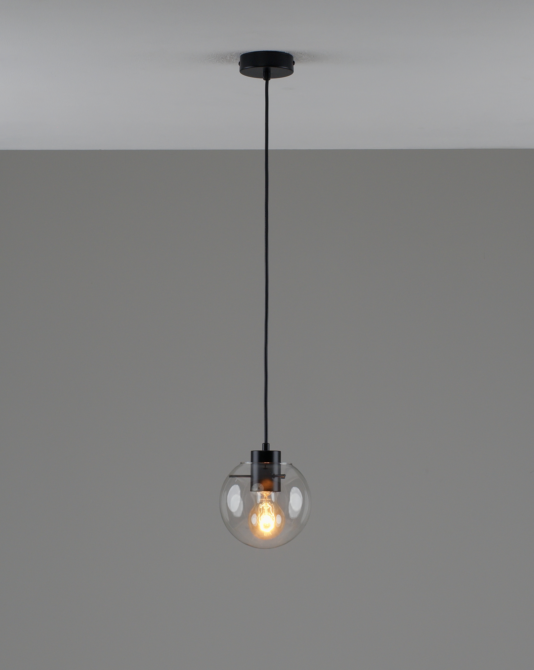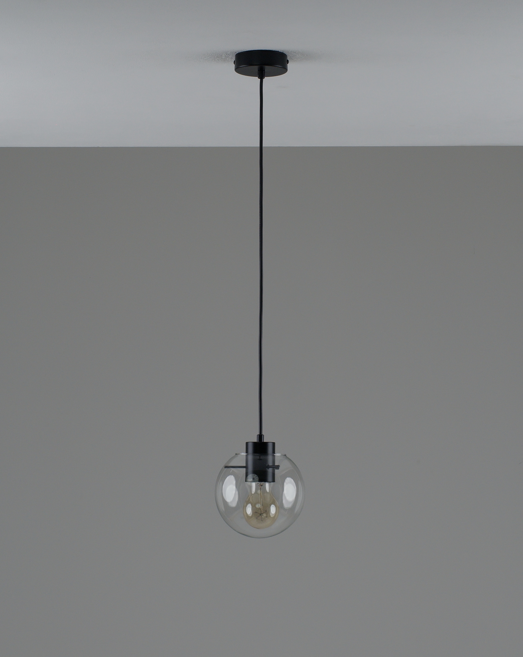 Подвесной светильник в современном стиле с плафоном из прозрачного стекла и арматурой черного цвета. Диаметр стеклянного плафона 15 см, в качестве источника света могут быть использованы лампы накаливания или LED с цоколем Е27.