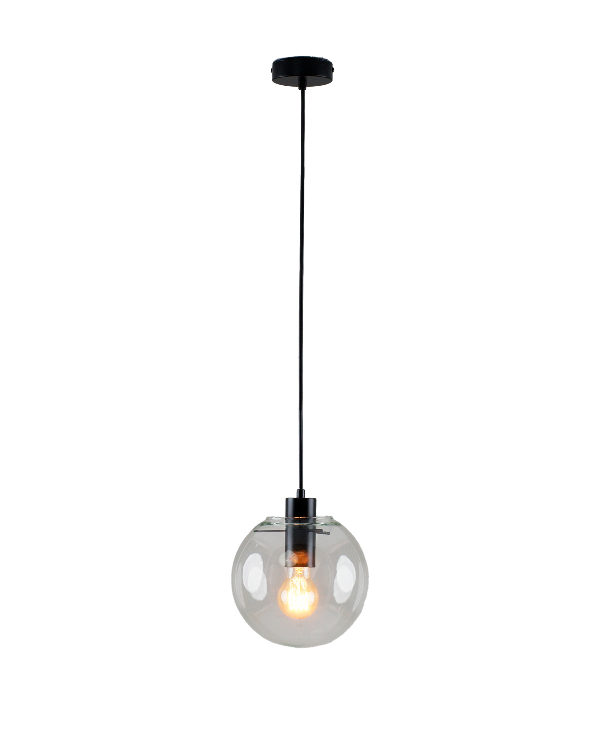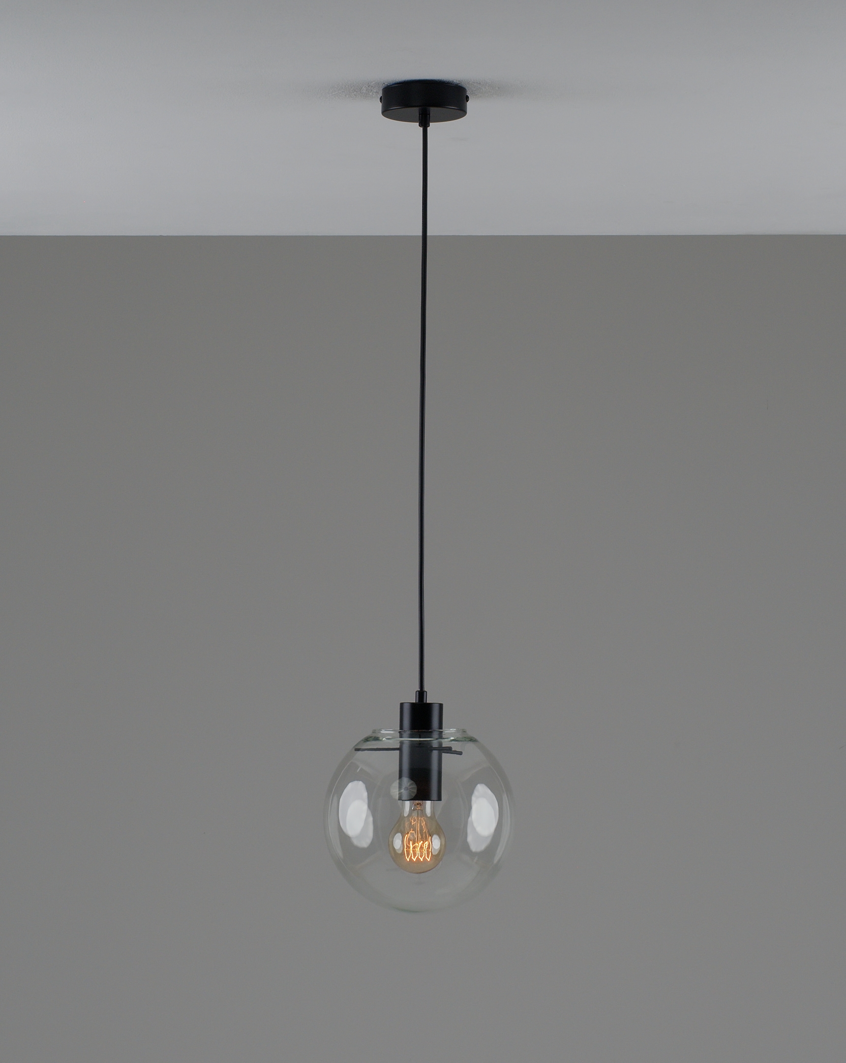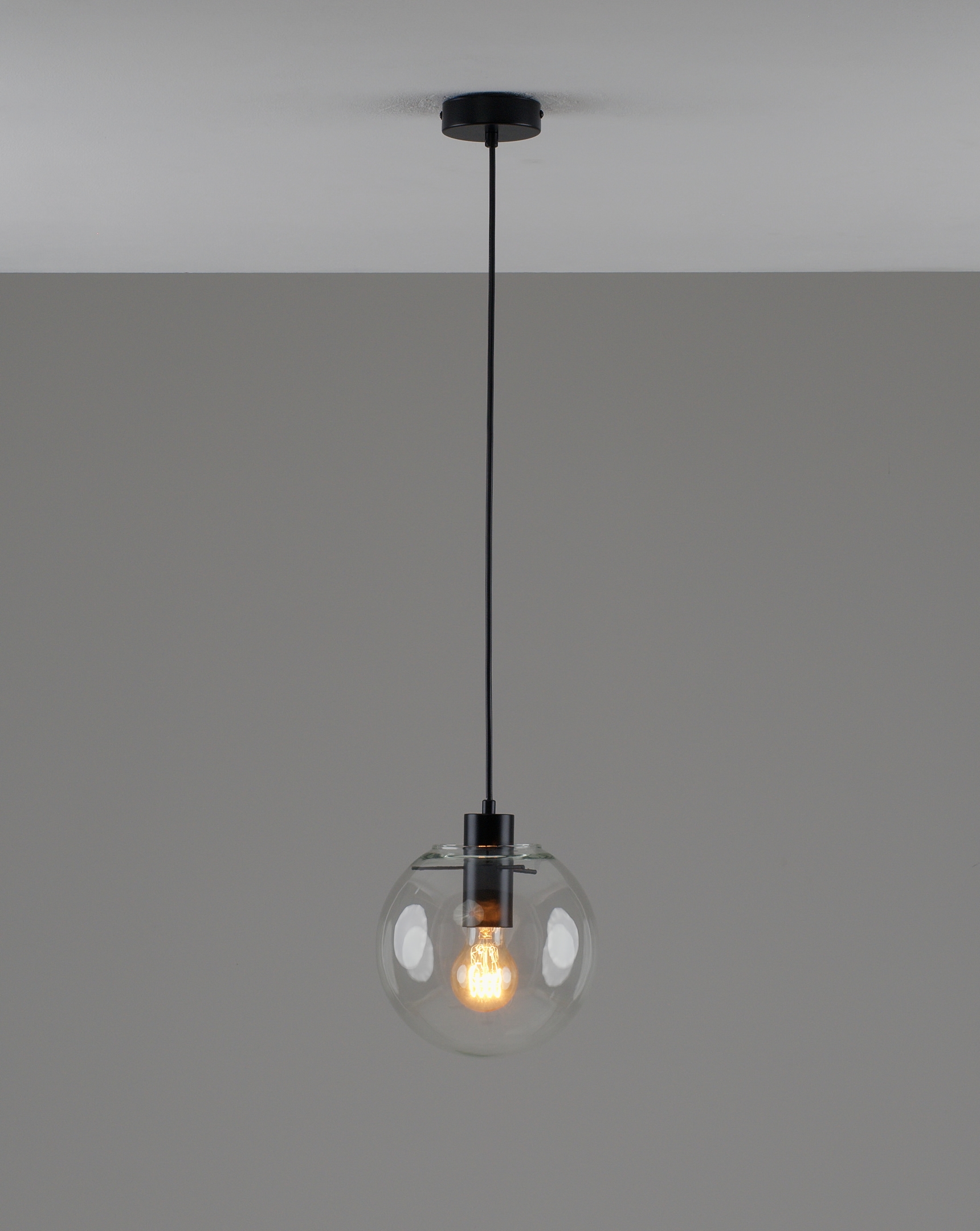 Подвесной светильник в современном стиле с плафоном из прозрачного стекла и арматурой черного цвета. Диаметр стеклянного плафона 20 см, в качестве источника света могут быть использованы лампы накаливания или LED с цоколем Е27.