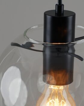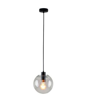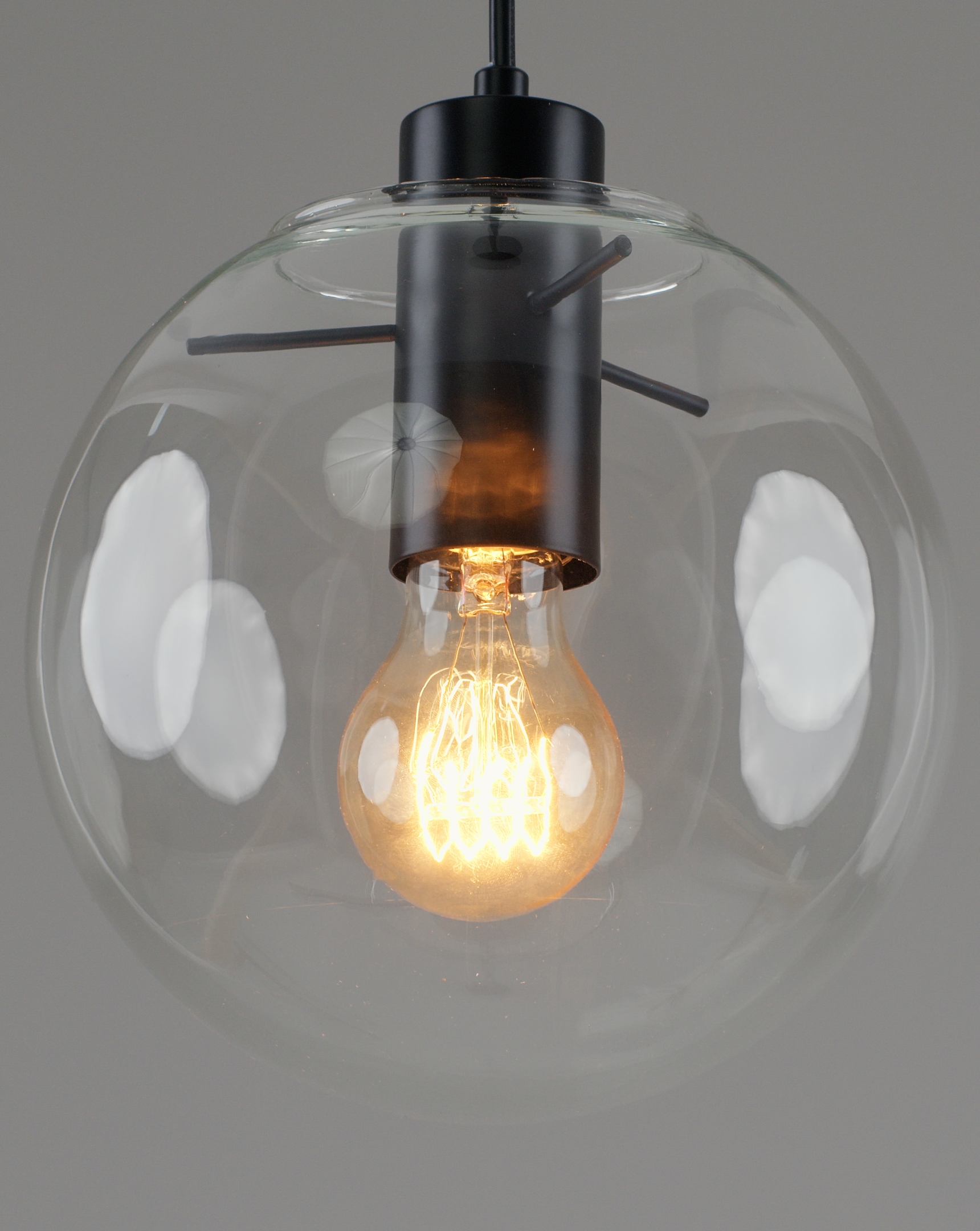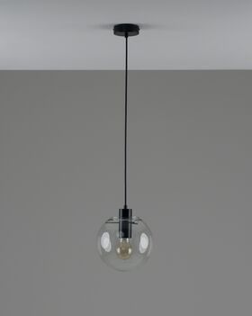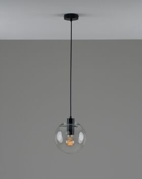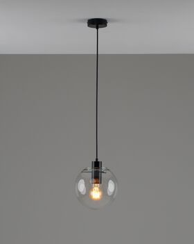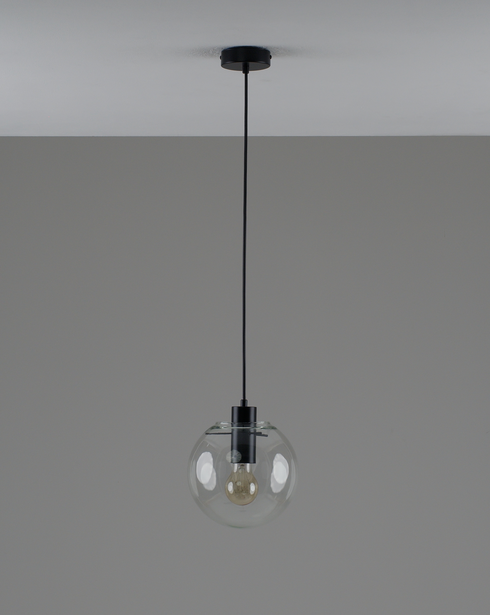 Подвесной светильник в современном стиле с плафоном из прозрачного стекла и арматурой черного цвета. Диаметр стеклянного плафона 20 см, в качестве источника света могут быть использованы лампы накаливания или LED с цоколем Е27.
